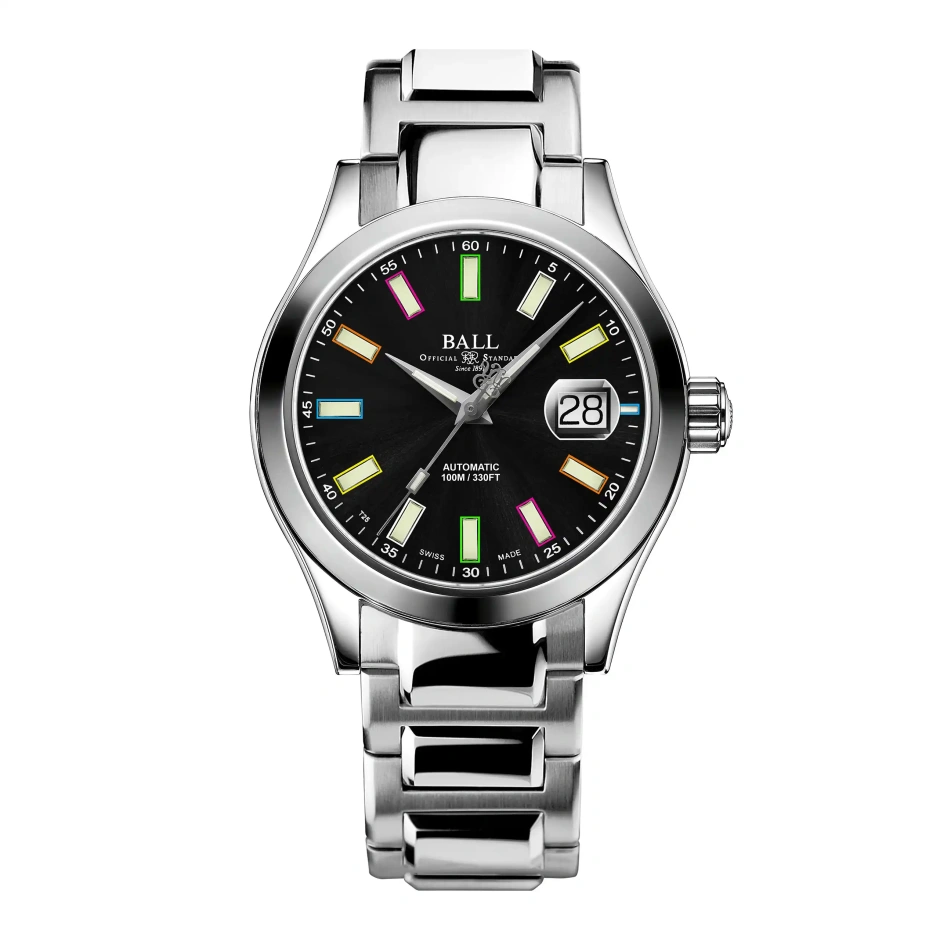 重量感とハイスペックが人気の定番モデル『マーべライト』より華やかなレインボー・カラーのモデル。視認性の良い立体的なインデックスに「ボールウォッチ」の代名詞暗所で輝く"自発光"のマイクロガスライトがグリーン・ホワイト・イエロー・ブルー・オレンジ・パープルの6色カラーで彩られて登場しました。ケースとブレスレットの素材には最高級ステンレススティール「904L」を採用しさらに、高精度の証明である「スイスCOSC認定クロノメーター」ムーブメントを搭載しております。