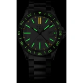 「異端児=アウトライアー」と名付けられたこのモデルは、既存の価値観から脱却して新たな世界にチャレンジするコンセプトのもと開発されました。高機能な904Lステレススティール製のケースに、操作性に優れるGMT機能付きの自社ムーブメント「キャリバー RRM7337-C」を搭載。リューズを1段引いたポジションで短針を単独可動(1時間毎)できる構造となっており、早送りも早戻しも調整が可能。日送り車も連動して動くため、カレンダーをローカルタイムの日付に素早く設定できます。さらにはスイスC.O.S.C.のクロノメーターを取得していますので平均日差-4秒~+6秒以内の高精度を保証。またその他にも、特殊合金ミューメタル製インナーケースを内蔵し80,000A/m(1,000 ガウス)までの磁気耐性や5,000Gsまでの耐衝撃性も備え、通常の機械式時計のスペックを優に超える性能を有しています。