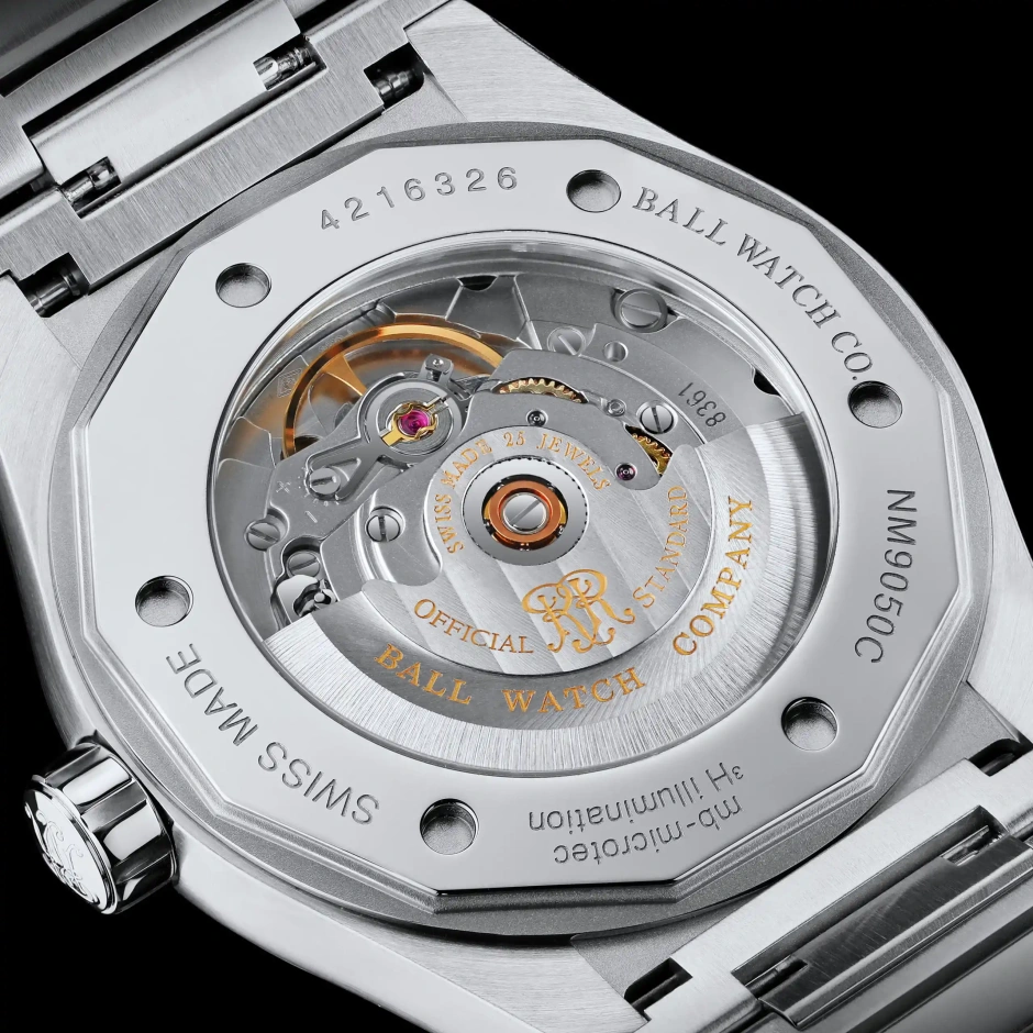 特筆すべき点として、最大80時間駆動を誇るボール ウォッチ自社製造の「BALLキャリバー RRM7309-C」を搭載しています。このマニュファクチュールムーブメントは、スイスウオッチの精度を保証するスイスC.O.S.C.認定クロノメーター検定(日差−4秒~+6秒以内)をクリアした後、ボール ウォッチが独自に設けているBALLオフィシャル スタンダード(日差−2秒~+4秒以内)という、より厳格な精度検査にパスした個体のみから選定しておりコレクション屈指の正確性を誇ります。