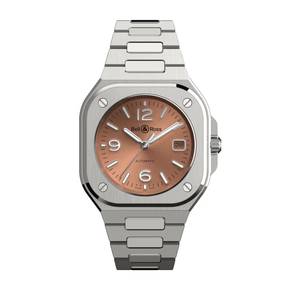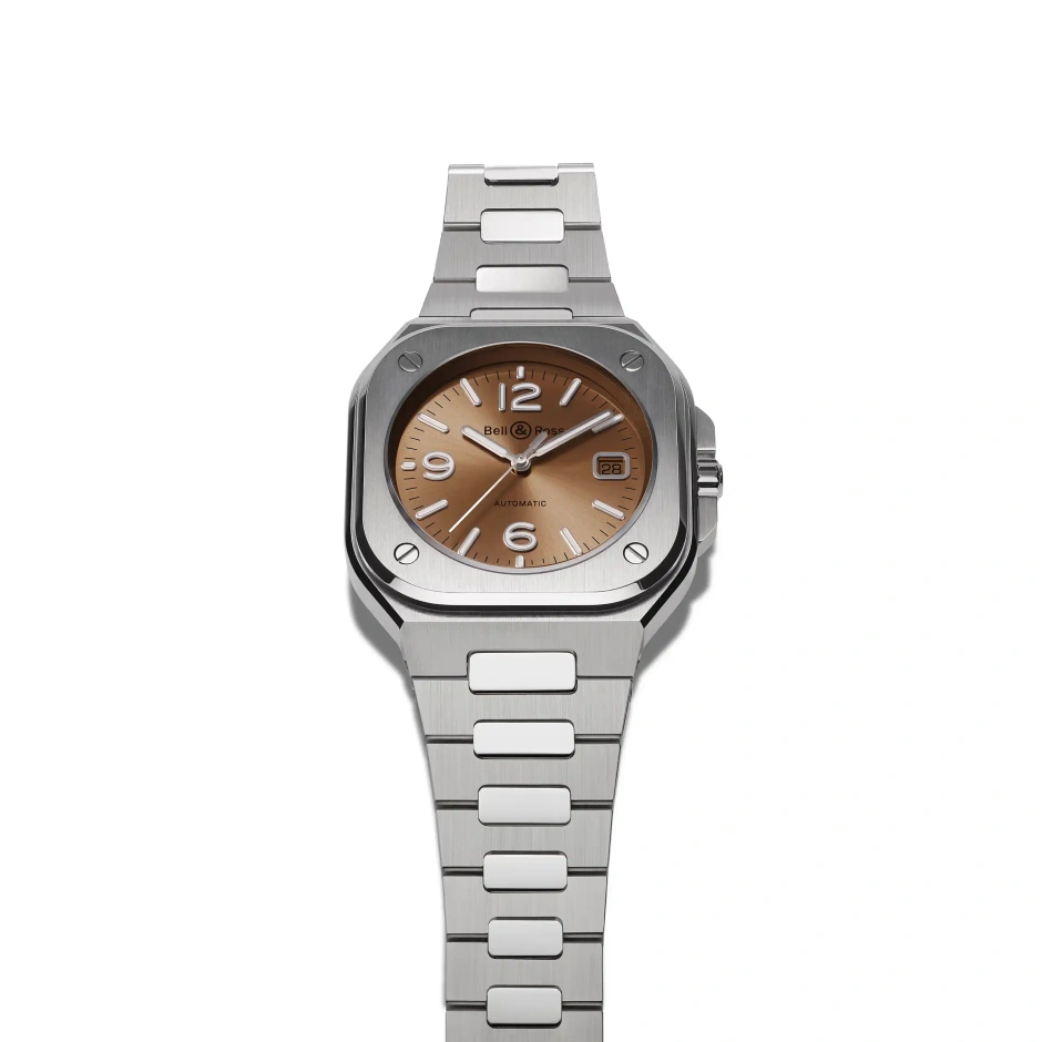 フランス発スイスメイドの高級ミリタリーウォッチブランド「ベル&ロス」の"都会派"ラグジュアリー・スポーツウォッチ「BR05」コレクションの新作カラー。サンバースト仕上げを施したゴールデンブラウンのダイヤルは、メタルプレートにブラウンの透明ニスを数回塗布することで深みが増し、手首を傾けると輝きが幾重にも変化します。サテン仕上げのプレートと鏡面仕上げの中ゴマを組み合わせた流麗なブレスレットも腕元をスタイリッシュに装います。