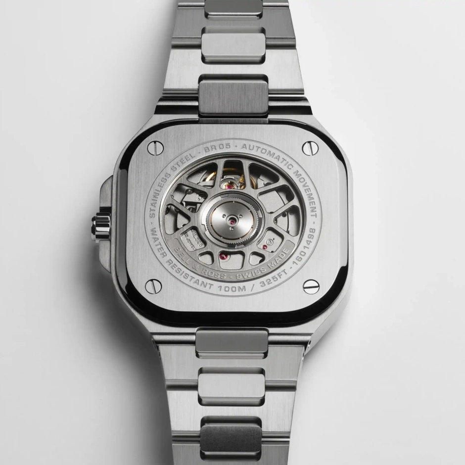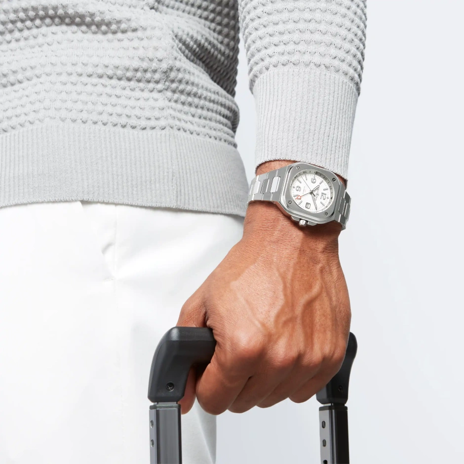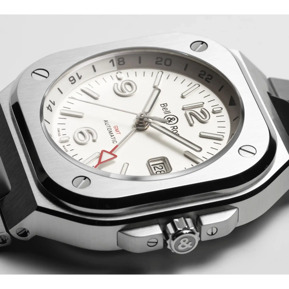 世界の2つの異なる時間帯を同時に表示する「GMT機能」を備えたモデルとなっております。ベル&ロスを象徴するラウンド&スクエアのケースと多面カットにテン仕上げのプレートと鏡面仕上げの中ゴマを組み合わせた流麗なブレスレット。 赤いアロー型のGMT針が、昼夜をひと目で読み取れるようホワイトとグレーに分かれた24時間目盛り付きインナーベゼルを指しています。