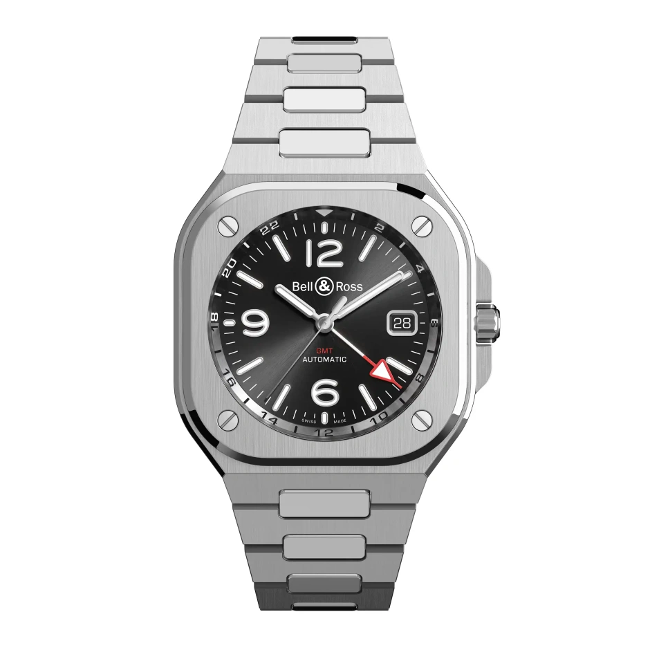 世界の2つの異なる時間帯を同時に表示する「GMT機能」を備えたモデルとなっております。ベル&ロスを象徴するラウンド&スクエアのケースと多面カットにテン仕上げのプレートと鏡面仕上げの中ゴマを組み合わせた流麗なブレスレット。 新たに搭載された赤いアロー型のGMT針が、昼夜をひと目で読み取れるよう ブラックとグレーに分かれた24時間目盛り付きインナーベゼルを指しています。