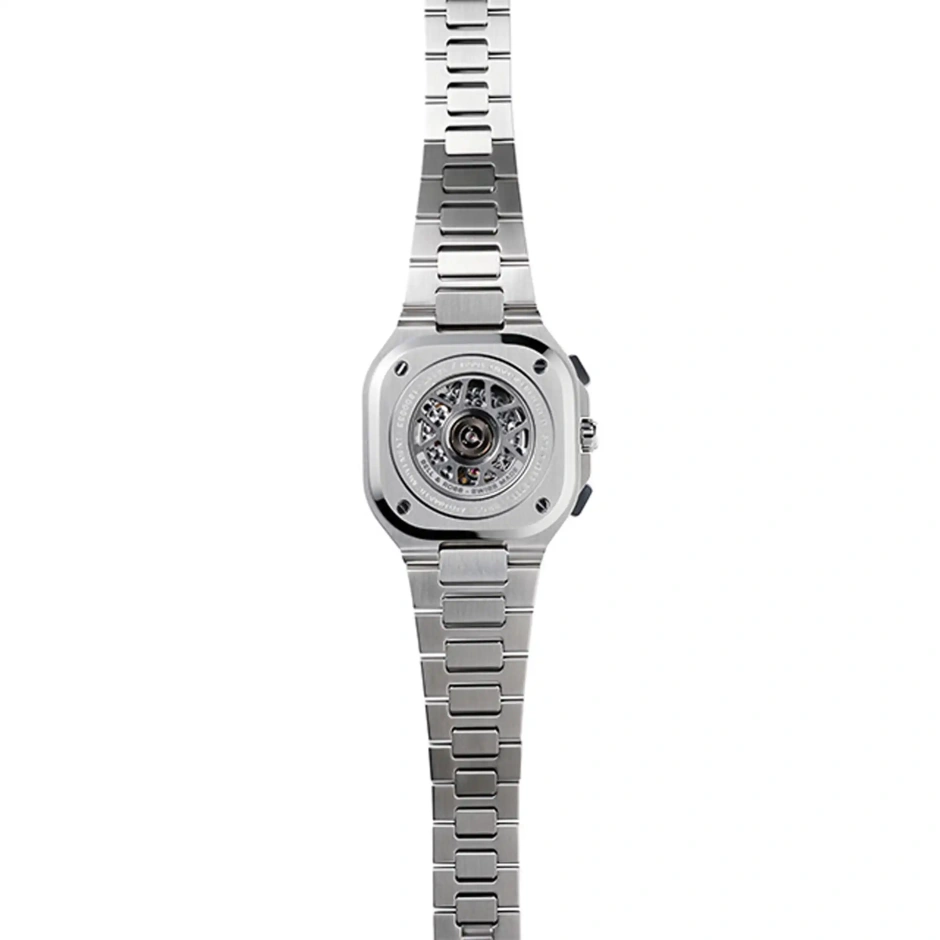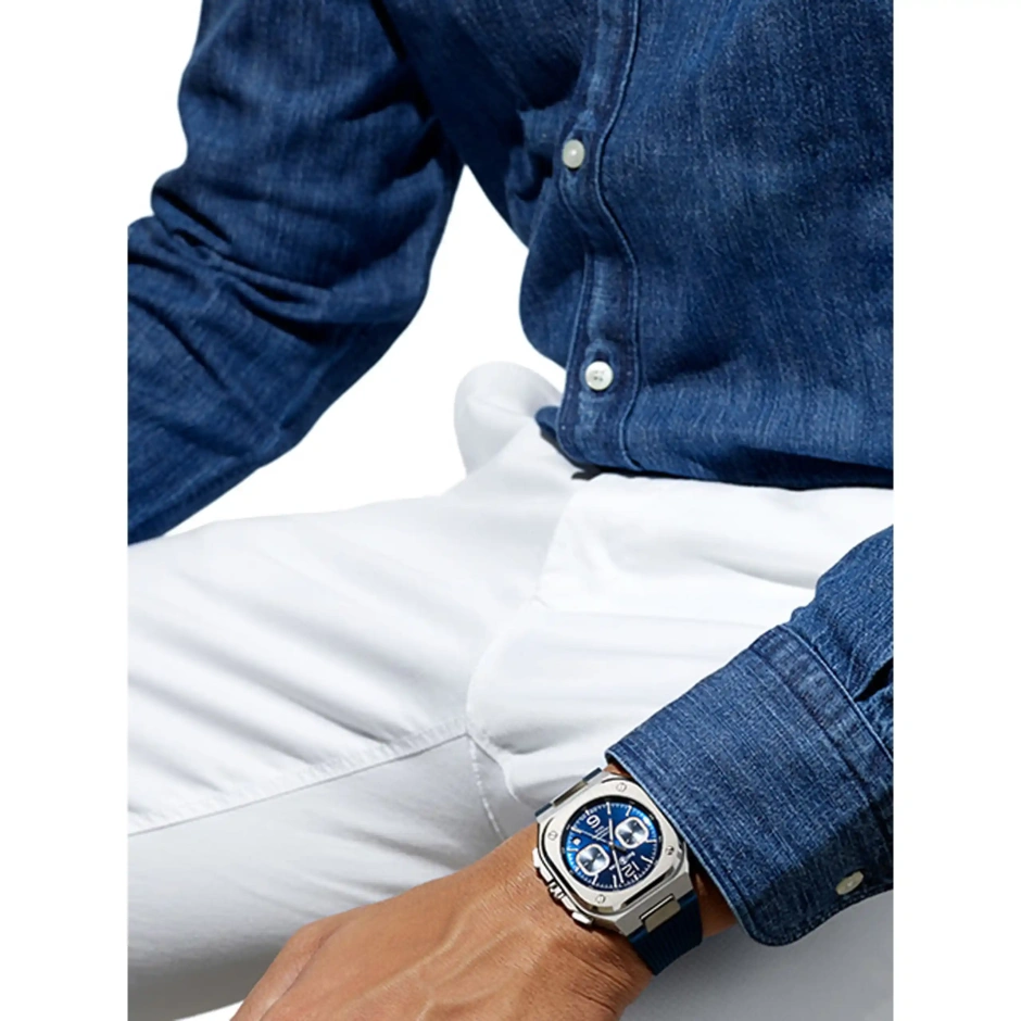 "都会の探究者"をテーマとするラグジュアリー・スポーツウォッチ「BR05」コレクションより クロノグラフ搭載モデル。ベル&ロスの代名詞である "ラウンド&スクエア"のケースに合わせて 丸と四角の中間のような形のクロノグラフカウンターが配置されております。 驚異的な多面カットの仕上げが施された 流麗なブレスレットも、美しさのみならず角度が綿密に計算されあらゆる手首にフィットする快適な着け心地です。