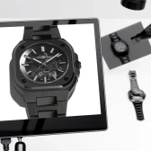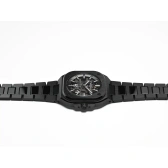 - 文字盤:ブラックカラーの透明なパネルおよびロジウムメッキのムーブメント付きスケルトン仕上げ。
