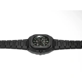 文字盤:ブラックカラーの透明なパネルおよびロジウムメッキのムーブメント付きスケルトン仕上げ。C5 スーパールミノバ® コーティング(グリーンの輝き)が施されたアプライド インデックス。C5 スーパールミノバ® コーティング(グリーンの輝き)が施されたスケルトンの時/分針。