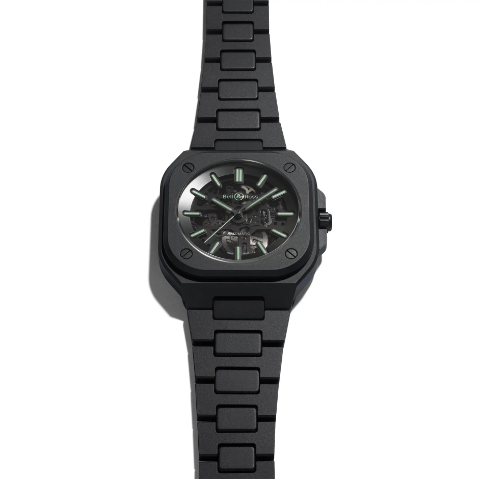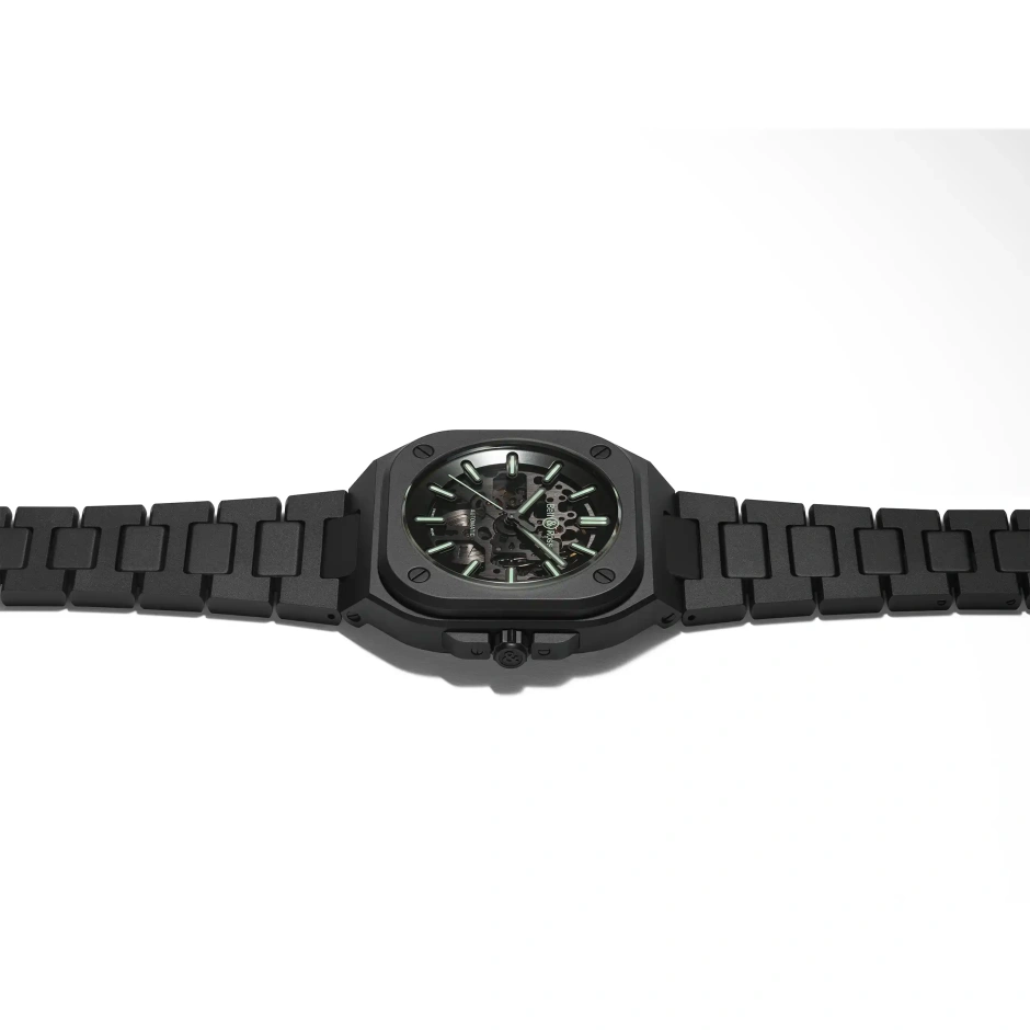 特別なスケルトンムーブメントにグリーン輝きを放つスーパールミノバ® コーティングの針とインデックス を搭載した「BR 05 Skeleton Black Lum Ceramic」は、高級時計の愛好家に向けられています。Bell & Ross が製造する全ての時計と同様に機能美を追求し、現代的なライフスタイルにおける日常にフィットするミニマルなエレガンスを誇ります。揺るぎない耐久性の為に、時計の堅牢性を保証する厳しい要求に対応する素材であるセラミックを選択しました。腐食や傷を寄せ付けないセラミックは、傷のつきにくい時代を超越した時計を作ります。またスティールよりも硬くて軽量である為、装着時の刺激が軽減され快適です。機械式自動巻きムーブメント「キャリバー BR-CAL.322-1」を搭載する事により、54 時間のパワーリザーブを保証します。
