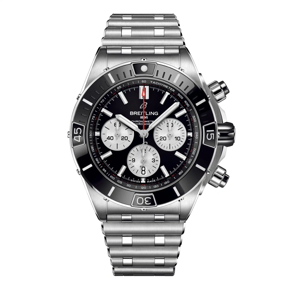 1983年にブライトリングがイタリア空軍のアクロバット飛行チームのために製作した「フレッチェ・トリコローリ」にインスパイアされた「スーパー クロノマット」。 力強さあふれる万能スポーツウォッチでありながら、夜の装いにもマッチするエレガントさを備えています。 ステンレススチール製ケースにブラックのダイヤルとベゼル、そしてコントラストの効いたシルバーのクロノグラフカウンターの組み合わせ。パワーリザーブ約70時間のCOSC公認自社開発製造キャリバー「ブライトリング01」を搭載しています。