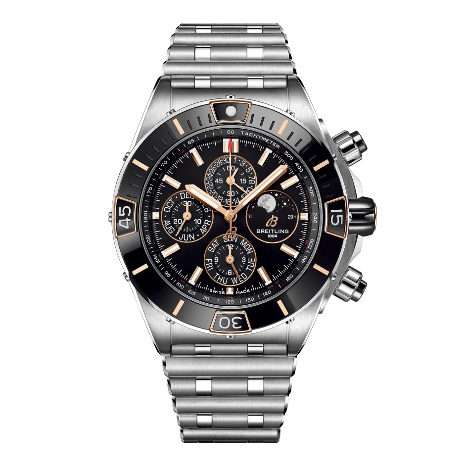 1983年にブライトリングがイタリア空軍のアクロバット飛行チームのために製作した「フレッチェ・トリコローリ」にインスパイアされた「スーパー クロノマット」は、力強さあふれる万能スポーツウォッチでありながら、夜の装いにもマッチするエレガントさを備えています。 「スーパー クロノマット 44 フォー イヤー カレンダー」は閏年に一度、つまり4年ごとに一度だけ調整が必要なセミパーペチュアルカレンダー機構を備えています。ブラックのダイヤルにクロノグラフカウンター、セラミックがインサートされたベゼルに18Kレッドゴールド製エレメントを組み合わせました。 COSC公認ブライトリング キャリバー19を搭載し、月・日付・曜日・ムーンフェイズ表示を備えます。
