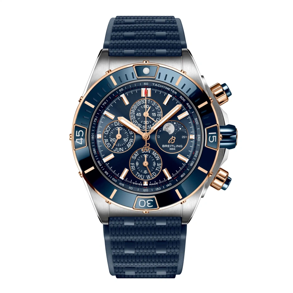 1983年にブライトリングがイタリア空軍のアクロバット飛行チームのために製作した「フレッチェ・トリコローリ」にインスパイアされた「スーパー クロノマット」は、力強さあふれる万能スポーツウォッチでありながら、夜の装いにもマッチするエレガントさを備えています。 「スーパー クロノマット 44 フォー イヤー カレンダー」は閏年に一度、つまり4年ごとに一度だけ調整が必要なセミパーペチュアルカレンダー機構を備えています。ブルーのダイヤルにクロノグラフカウンター、セラミックがインサートされたベゼルに18Kレッドゴールド製エレメントを組み合わせました。 COSC公認ブライトリング キャリバー19を搭載し、月・日付・曜日・ムーンフェイズ表示を備えます。