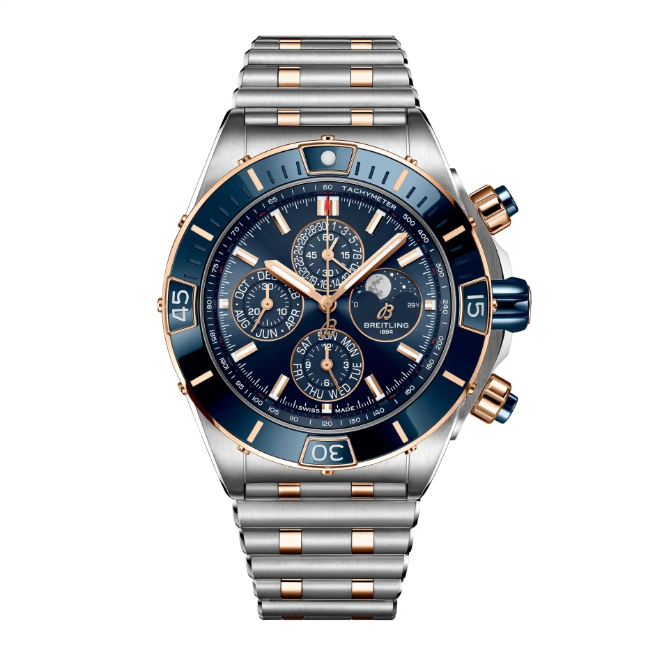 1983年にブライトリングがイタリア空軍のアクロバット飛行チームのために製作した「フレッチェ・トリコローリ」にインスパイアされた「スーパー クロノマット」は、力強さあふれる万能スポーツウォッチでありながら、夜の装いにもマッチするエレガントさを備えています。 「スーパー クロノマット 44 フォー イヤー カレンダー」は閏年に一度、つまり4年ごとに一度だけ調整が必要なセミパーペチュアルカレンダー機構を備えています。ブルーのダイヤルにクロノグラフカウンター、セラミックがインサートされたベゼルに18Kレッドゴールド製エレメントを組み合わせました。 COSC公認ブライトリング キャリバー19を搭載し、月・日付・曜日・ムーンフェイズ表示を備えます。