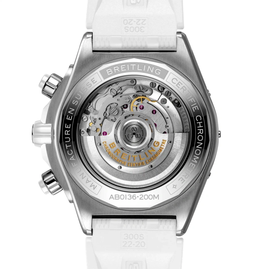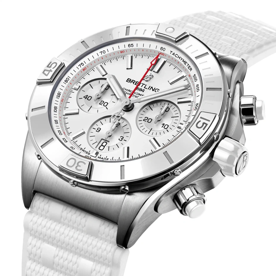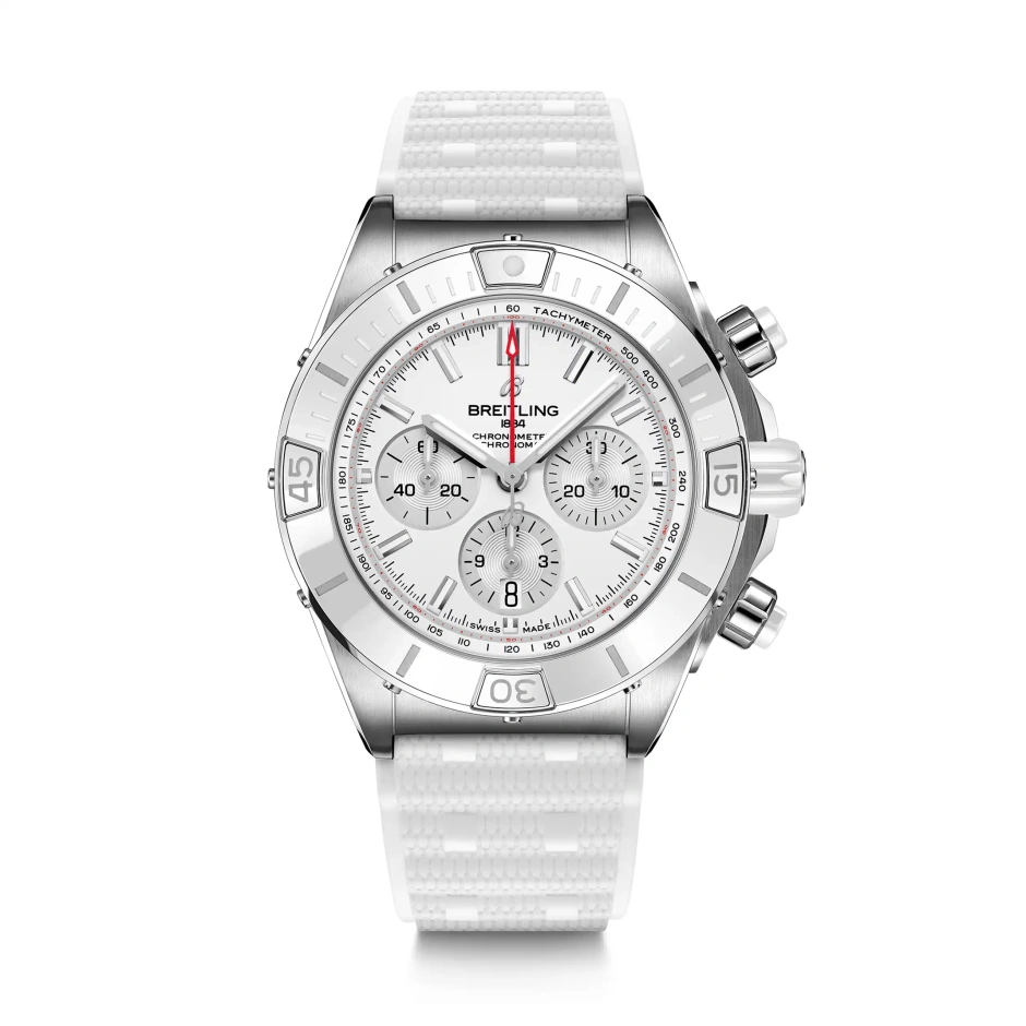 クロノマットの中で最も際立ったモデルであるスーパー クロノマットは、ベゼル、クロノグラフのプッシュボタン、リューズなどにセラミック インサートを使用しており、1980年代にブライトリングがイタリア空軍のエアロバティック・チームのパイロットのために製作したオリジナル・クロノマットのルーローブレスレットにインスパイアされたラバーストラップが特徴です。こちらの日本限定モデルは、アイコニックなセラミックインサートとラバーストラップをホワイトに仕立てた特別仕様。白で統一された外観によりスタイルを際立たせます。COSC公認クロノメーターのブライトリング キャリバー01搭載。