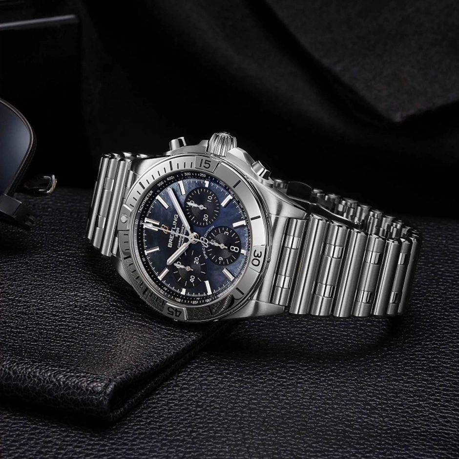 ハイエンドモデルのクロノマットに人気のマザー・オブ・パールを使用した特別仕様の日本限定モデル。 1984年の初代クロノマットで採用された筒形の「ルーローブレスレット」を復活させたモダンレトロなデザイン。 ムーブメントは約70時間のパワーリザーブを誇る、COSC公認クロノメーターの自社開発製造キャリバー「B01」を搭載。 新旧の融合とそのバランスを堪能頂ける魅力的な一本です。