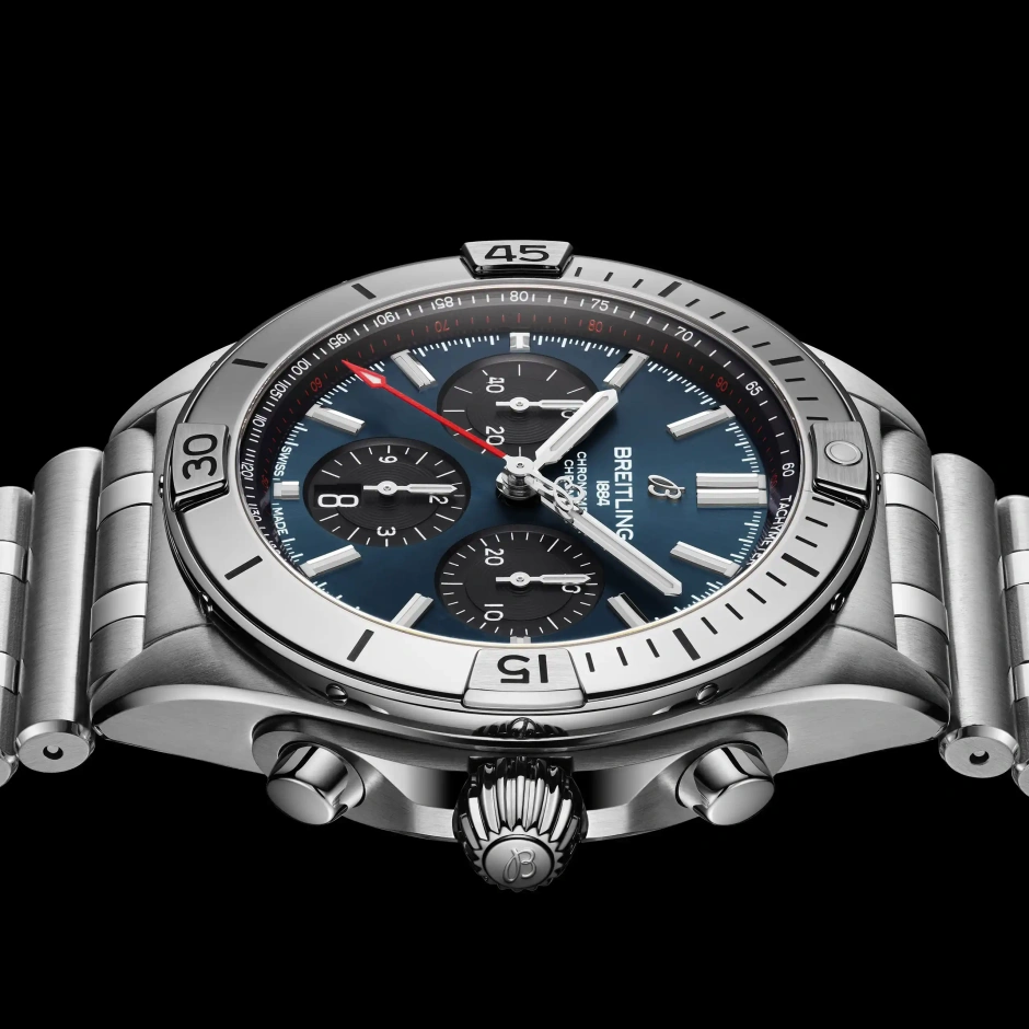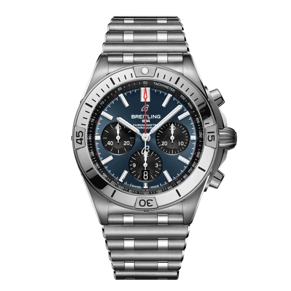 あらゆる要望に応える、ブライトリングの万能モデル。 クロノマットは、ブライトリングの歴史の中で重要な位置を占めるモデルです。 ステンレススチールの42ミリケースと4カ所にライダータブを配したアイコニックなベゼル。独特な「ルーロー」ブレスレットがしっくりと馴染みます。 ムーブメントはCOSC公認クロノメーターのブライトリング自社開発製造キャリバー01です。