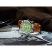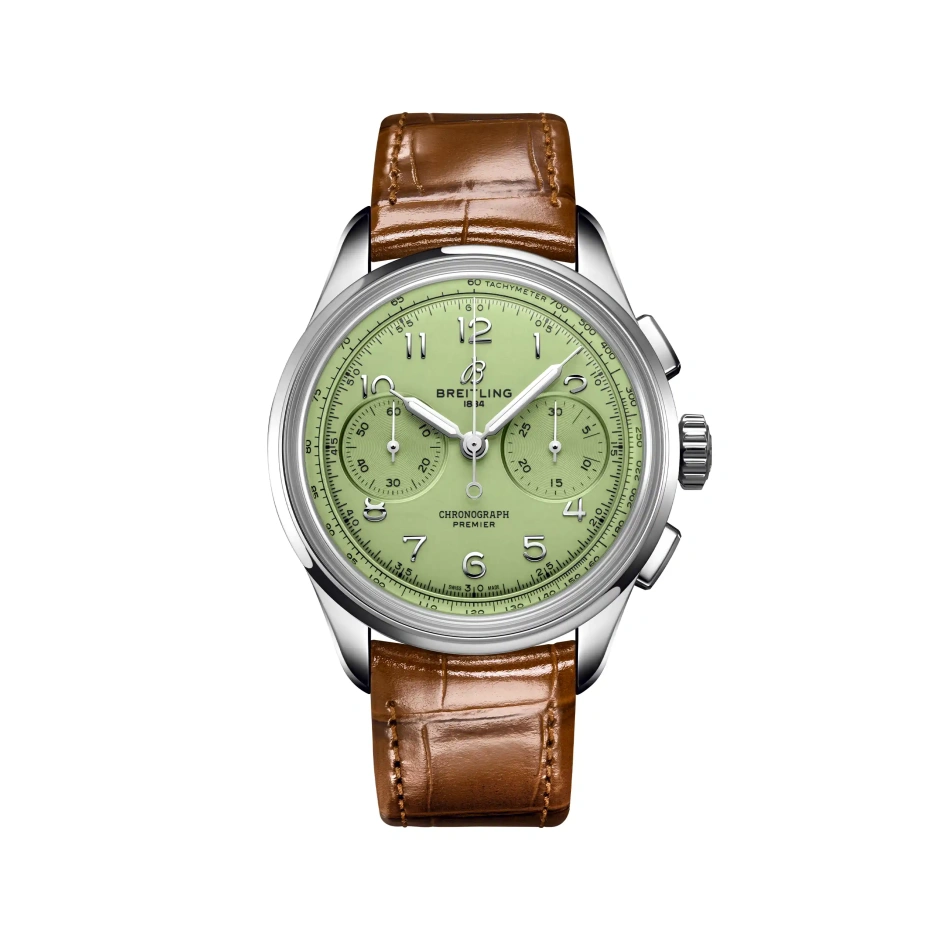 レオン、ガストン、ウィリー・ブライトリングという3世代の創業家へのオマージュを込めたプレミエ クロノグラフは、近代のクロノグラフラフを発明したブライトリングのレガシーを体現したものです。長方形のクロノグラフプッシャー、バイコンパックス・クロノグラフ、アラビア数字の特徴に加え、ケースサイドの溝、サファイアのオープンケースバック、ヴィンテージ風の針などエレガントなデザインディテールが様々に施され、手巻き式のCOSC認証を受けたブライトリングマニュファクチュールキャリバーB09で駆動します。