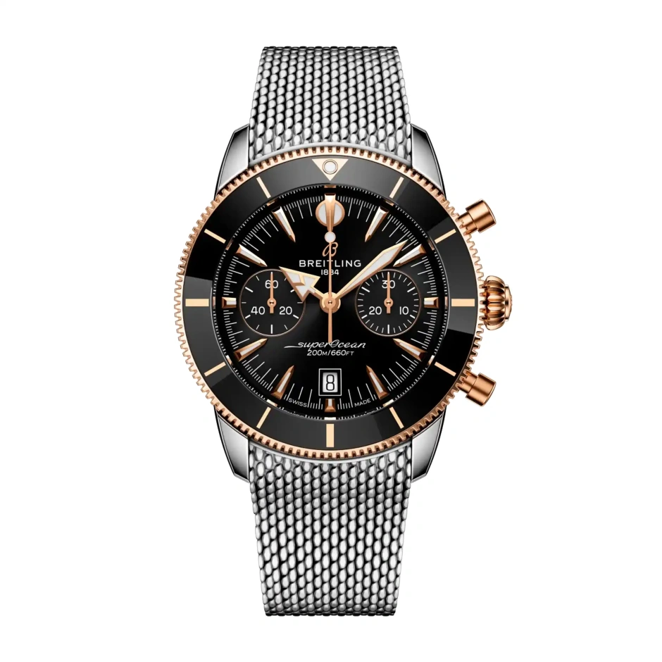 最新のSuperocean Heritageは、オリジナルの特徴をすべて踏襲し、さらに洗練されています。このクロノグラフは、Breitlingの業界をリードする計時ムーブメントであるブライトリング・マニュファクチュールキャリバー 01を搭載しています。セラミックインレイのベゼルは優れた耐傷性を提供し、一体型のメッシュメタルまたはメッシュラバーブレスレットはケースにぴったりとフィットし、折りたたみ式クラスプでしっかりと固定され、すっきりとした防水仕上げを実現します。トーン・オン・トーンのサブダイヤル、6時位置の控えめな日付ウィンドウ、そしてオリジナルのシグネチャー針(時を示す矢印、分を示す槍)により、表面の上でも下でも、視認性とバランスが保たれています。