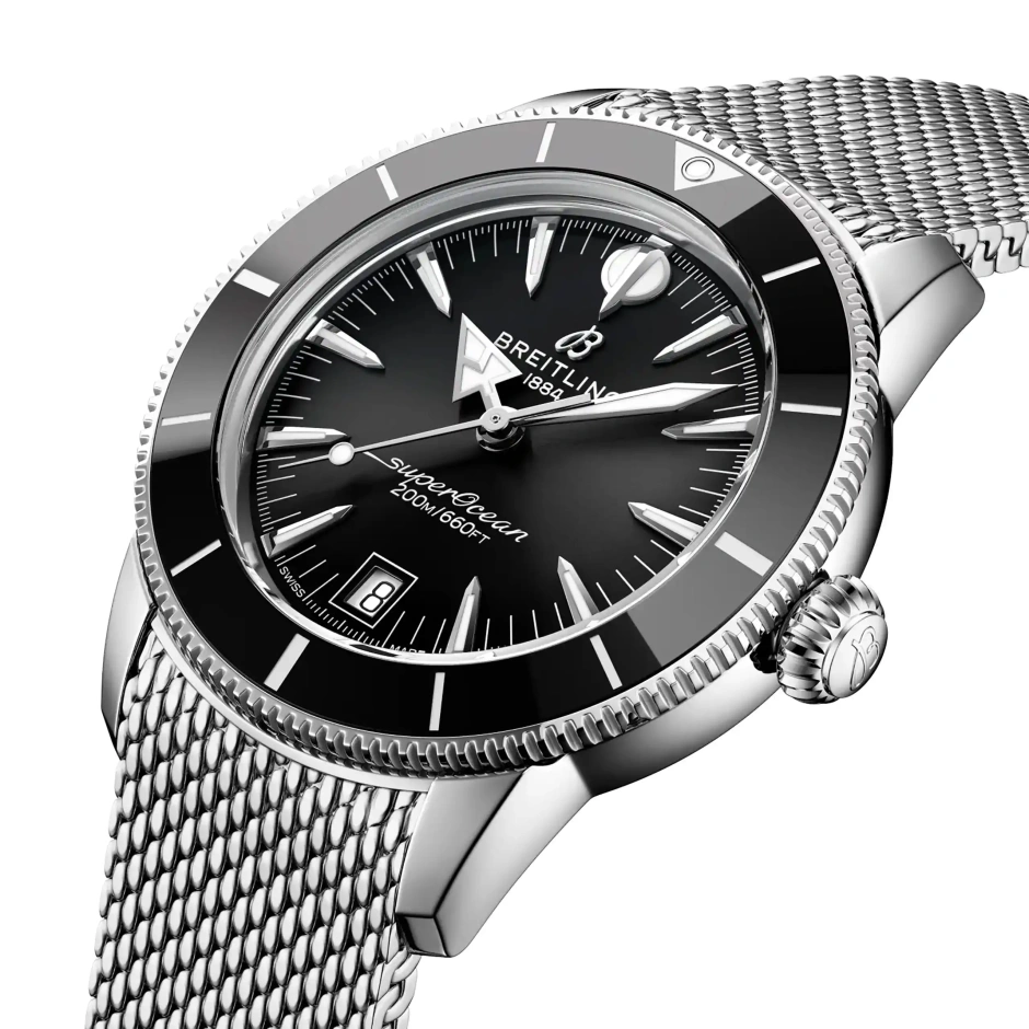 最新のSuperocean Heritageは、オリジナルの特徴をすべて踏襲し、さらに洗練されています。このコレクションには、ブライトリング初の自社製3針ムーブメント「キャリバーB31」が搭載されています。セラミックインレイのベゼルは優れた耐傷性を提供し、一体型のメッシュメタルまたはメッシュラバーブレスレットはケースにぴったりとフィットし、折りたたみ式クラスプでしっかりと固定され、すっきりとした防水仕上げを実現します。6時位置に控えめな日付表示窓と、オリジナルのシグネチャー針(時間を示す矢印、分を示す槍)が、表面の上でも下でも、視認性とバランスを確保します。