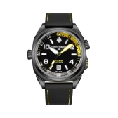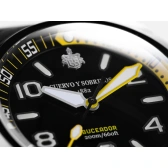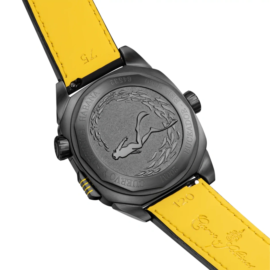 シアンカラーの海、パステルカラーの砂浜、キューバの海の世界にインスピレーションを得たダイバーズウォッチ。カリブ海の魅力を湛えた実用性とスタイリッシュさを兼ね備えています。「ブセアドール カリブ」は、キューバの海岸線を取り囲む澄んだ海の色彩を取り入れたコンテンポラリーウォッチです。直線と曲線を組み合わせたケース形状は、ダイビングタンクやシュノーケルからインスピレーションを得て、リューズやプッシャーにデザインされています。コンテナ型の構造を持つ複雑なケースは200mという高い防水性を確保しました。 4時位置に配置された独創的なプッシャーは、2時位置のリューズのロックを解除するもので、リューズで内部の回転ベゼルを調整し、潜水時間を確認することができます。通常の時刻調整と巻き上げのリューズは9時位置に設置されています。 ダイヤルには、太い時針と分針、そして視認性に優れたインデックスを備えています。針とインデックスにはスーパールミノバが塗布され、薄暗い場所での視認性を高めています。