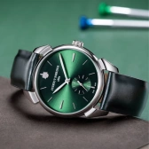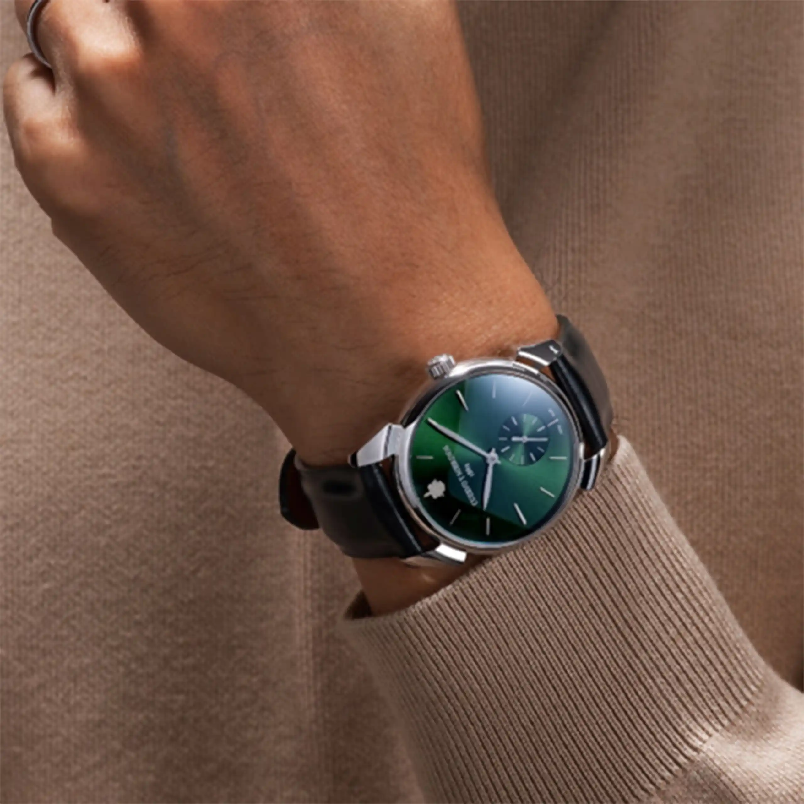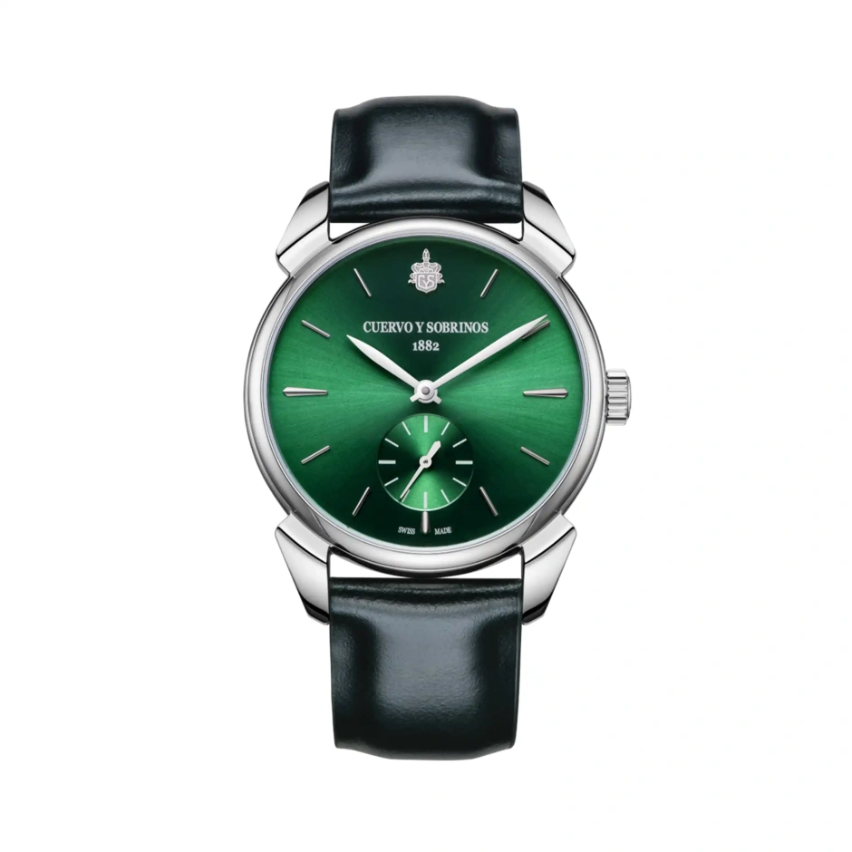 ヒストリアドール アストゥリアスに新たにスモールセコンドモデルが加わりました。 『ヒストリアドール・アストゥリアス』は、1940年代に製造されたクエルボ・イ・ソブリノスを象徴するアールデコ様式美を大胆かつエレガントに取り入れたラウンドモデルを原型としています。端正なラウンドケースと、ティアドロップ(涙滴形)に猫足をミックスしたユニークなラグとの組み合わせが、当時の優雅でエレガントな雰囲気を伝えています。手首のカーブに沿うように緩やかな弧を描くラグ形状が、デザイン面だけでなく快適な装着感を実現。ケース径40mmのSS製ケースは丁寧に研磨され、美しい曲線で構成されたラウンドケースの輪郭を強調しています。