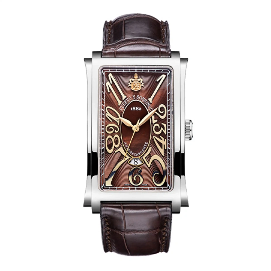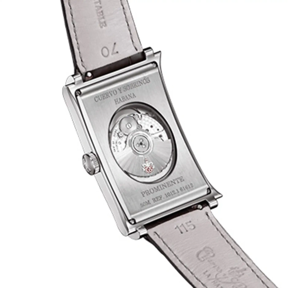 「プロミネンテ」は、クエルボ・イ・ソブリノスの価値観が完璧に体現されたアイコニックなコレクション。 その名称は最大サイズのキューバシガーの名称から命名されました。 落ち着きがあり洗練されたエレガンスは、時代を超越したクラシックと呼べるものです。 クエルボ・イ・ソブリノスの歩みとともに、「プロミネンテ」は時代に合わせて変化をしながら存在し続けています。 細長いレクタンギュラーシェイプケースはわずかに湾曲しており、52mmというサイズながらパーフェクトなフィット感を得られます。 ダイヤルのデザインも個性的でセンターに配されたマザー・オブ・パールと、その周囲のギョーシェ模様の組み合わせは最新の技術を駆使して製作されました。