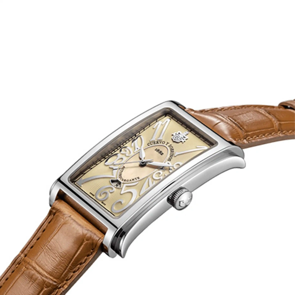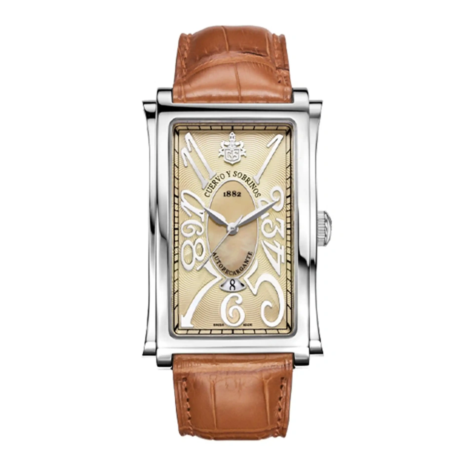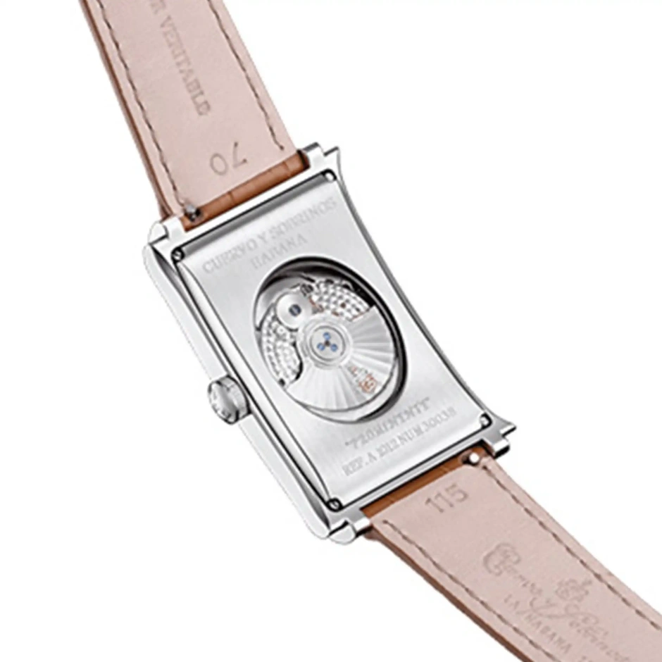 「プロミネンテ」は、クエルボ・イ・ソブリノスの価値観が完璧に体現されたアイコニックなコレクション。 その名称は最大サイズのキューバシガーの名称から命名されました。 落ち着きがあり洗練されたエレガンスは、時代を超越したクラシックと呼べるものです。 クエルボ・イ・ソブリノスの歩みとともに、「プロミネンテ」は時代に合わせて変化をしながら存在し続けています。 細長いレクタンギュラーシェイプケースはわずかに湾曲しており、52mmというサイズながらパーフェクトなフィット感を得られます。 ダイヤルのデザインも個性的でセンターに配されたマザー・オブ・パールと、その周囲のギョーシェ模様の組み合わせは最新の技術を駆使して製作されました。