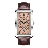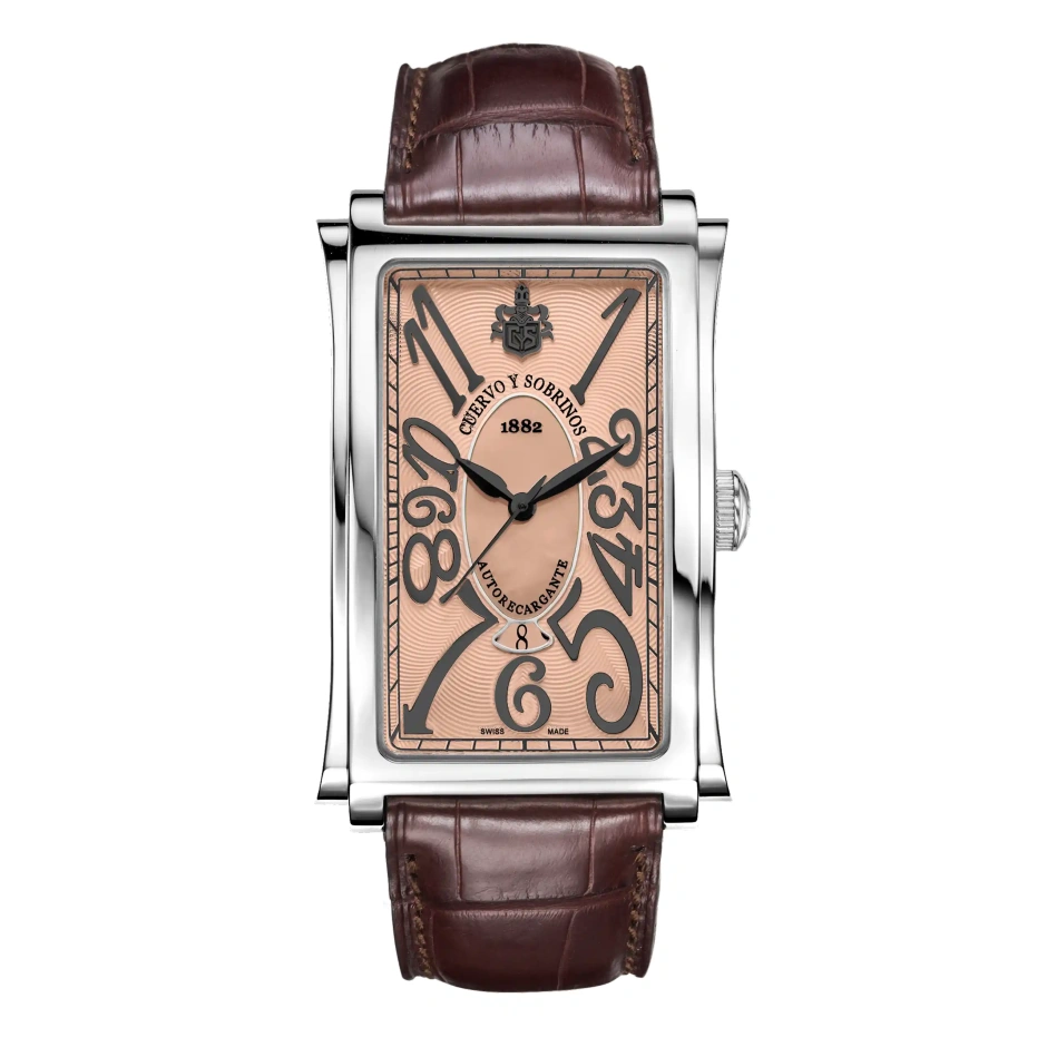 「プロミネンテ」は、クエルボ・イ・ソブリノスの価値観が完璧に体現されたアイコニックなコレクション。 その名称は最大サイズのキューバシガーの名称から命名されました。 落ち着きがあり洗練されたエレガンスは、時代を超越したクラシックと呼べるものです。 クエルボ・イ・ソブリノスの歩みとともに、「プロミネンテ」は時代に合わせて変化をしながら存在し続けています。 細長いレクタンギュラーシェイプケースはわずかに湾曲しており、52mmというサイズながらパーフェクトなフィット感を得られます。 ダイヤルのデザインも個性的でセンターに配されたマザー・オブ・パールと、その周囲のギョーシェ模様の組み合わせは最新の技術を駆使して製作されました。