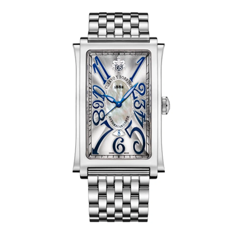「プロミネンテ」は、クエルボ・イ・ソブリノスの価値観が完璧に体現されたアイコニックなコレクション。 その名称は最大サイズのキューバシガーの名称から命名されました。 落ち着きがあり洗練されたエレガンスは、時代を超越したクラシックと呼べるものです。 クエルボ・イ・ソブリノスの歩みとともに、「プロミネンテ」は時代に合わせて変化をしながら存在し続けています。 細長いレクタンギュラーシェイプケースはわずかに湾曲しており、52mmというサイズながらパーフェクトなフィット感を得られます。 ダイヤルのデザインも個性的でセンターに配されたマザー・オブ・パールと、その周囲のギョーシェ模様の組み合わせは最新の技術を駆使して製作されました。