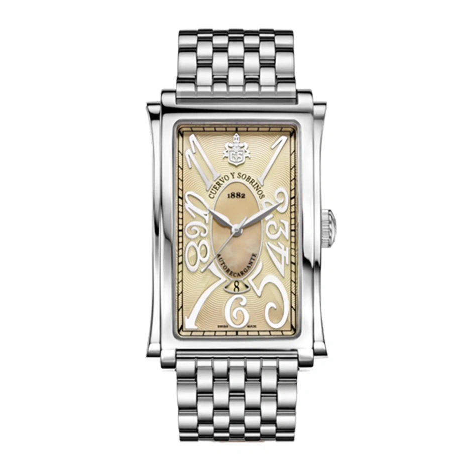「プロミネンテ」は、クエルボ・イ・ソブリノスの価値観が完璧に体現されたアイコニックなコレクション。 その名称は最大サイズのキューバシガーの名称から命名されました。 落ち着きがあり洗練されたエレガンスは、時代を超越したクラシックと呼べるものです。 クエルボ・イ・ソブリノスの歩みとともに、「プロミネンテ」は時代に合わせて変化をしながら存在し続けています。 細長いレクタンギュラーシェイプケースはわずかに湾曲しており、52mmというサイズながらパーフェクトなフィット感を得られます。 ダイヤルのデザインも個性的でセンターに配されたマザー・オブ・パールと、その周囲のギョーシェ模様の組み合わせは最新の技術を駆使して製作されました。
