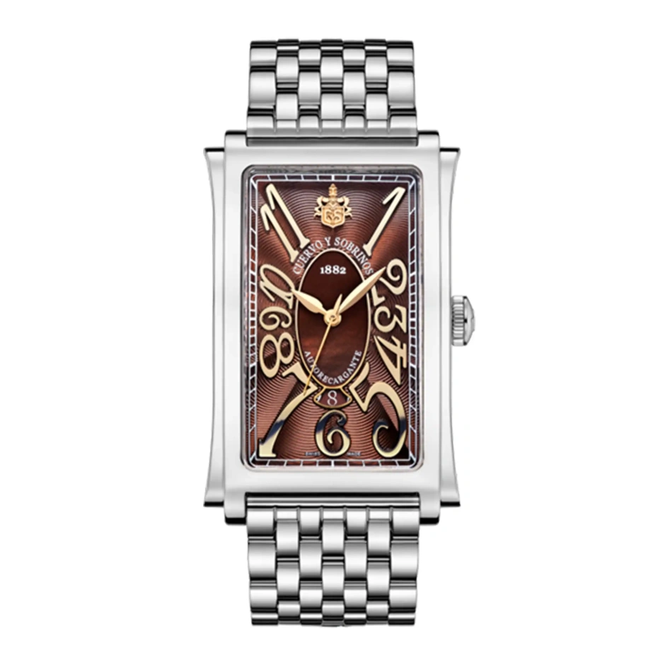 「プロミネンテ」は、クエルボ・イ・ソブリノスの価値観が完璧に体現されたアイコニックなコレクション。 その名称は最大サイズのキューバシガーの名称から命名されました。 落ち着きがあり洗練されたエレガンスは、時代を超越したクラシックと呼べるものです。 クエルボ・イ・ソブリノスの歩みとともに、「プロミネンテ」は時代に合わせて変化をしながら存在し続けています。 細長いレクタンギュラーシェイプケースはわずかに湾曲しており、52mmというサイズながらパーフェクトなフィット感を得られます。 ダイヤルのデザインも個性的でセンターに配されたマザー・オブ・パールと、その周囲のギョーシェ模様の組み合わせは最新の技術を駆使して製作されました。