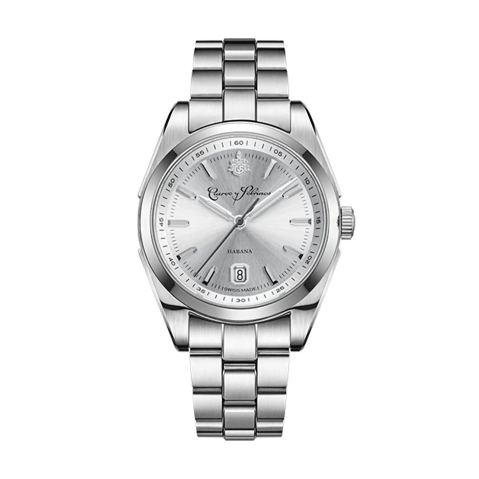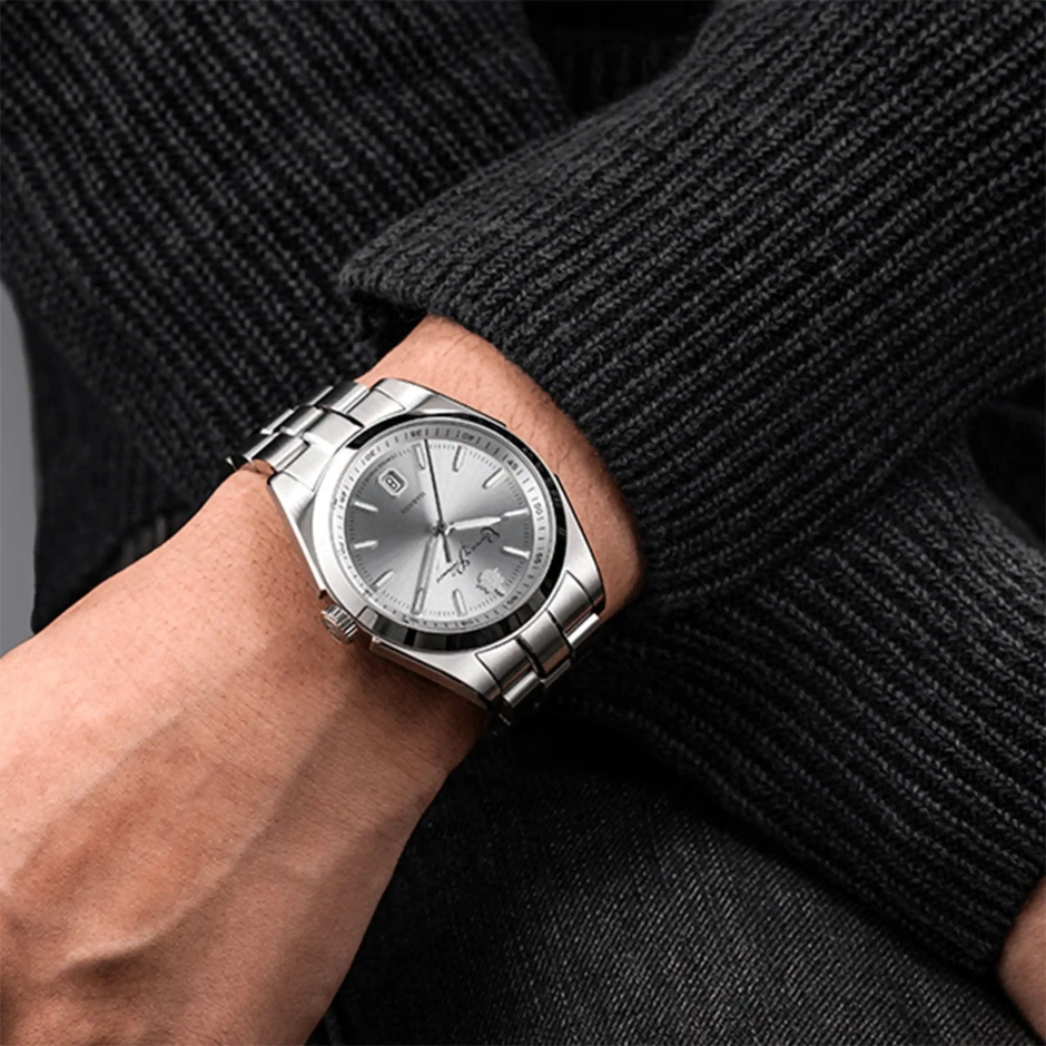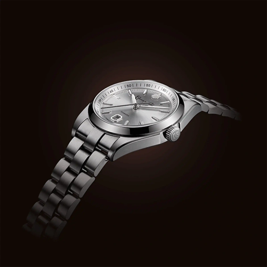 シルバー、ネイビーブルー、アップルグリーンのダイヤル色からお選びいただける「Robusto 1935」には、スーパールミノバ® 付きの特徴的なファセットカットの時針と分針が備わっています。 それぞれのアワー・インデックスは、やはり発光処理が取り入れられた多面的なアプライド・インデックスで表示されてる為、昼夜を問わずダイヤルは明晰そのものです。 中央の秒針はダイヤルの端にあるトラックと対話し、6時位置に表示される日付は八角形のブライトワークで縁取られています。ダイヤルは、光を吸収する最適な形状の二重カーブしたサファイアクリスタルの下にあり、視認性が向上しました。 ローターには透かし彫りが施されており、「ORIGINAL CASE DESIGN FROM 1935」(訳注: 1935年のオリジナルのケースデザイン)と刻印されています。