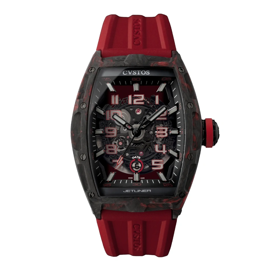 「ジェットライナー カーボン」は、太めのバトンインデックスとアラビア数字のインデックス両方を持つことで視認性を最大限まで高めています。内側に向かって滑らかに傾斜するベゼルには5分単位の分表示が従来よりも大きな数字で刻まれており、細部まで読みやすくなりました。
