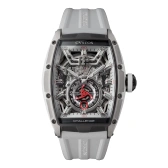 6時位置にあるスモールセコンドには大型タービンを想起させる羽根車が取り付けられ、クストスの根底に宿る機能美が全面に表現されています。 またムーブメント内部には、機械式時計にとって不文律であった“磁力”を使い技術革新のさらなる追求もなされています。