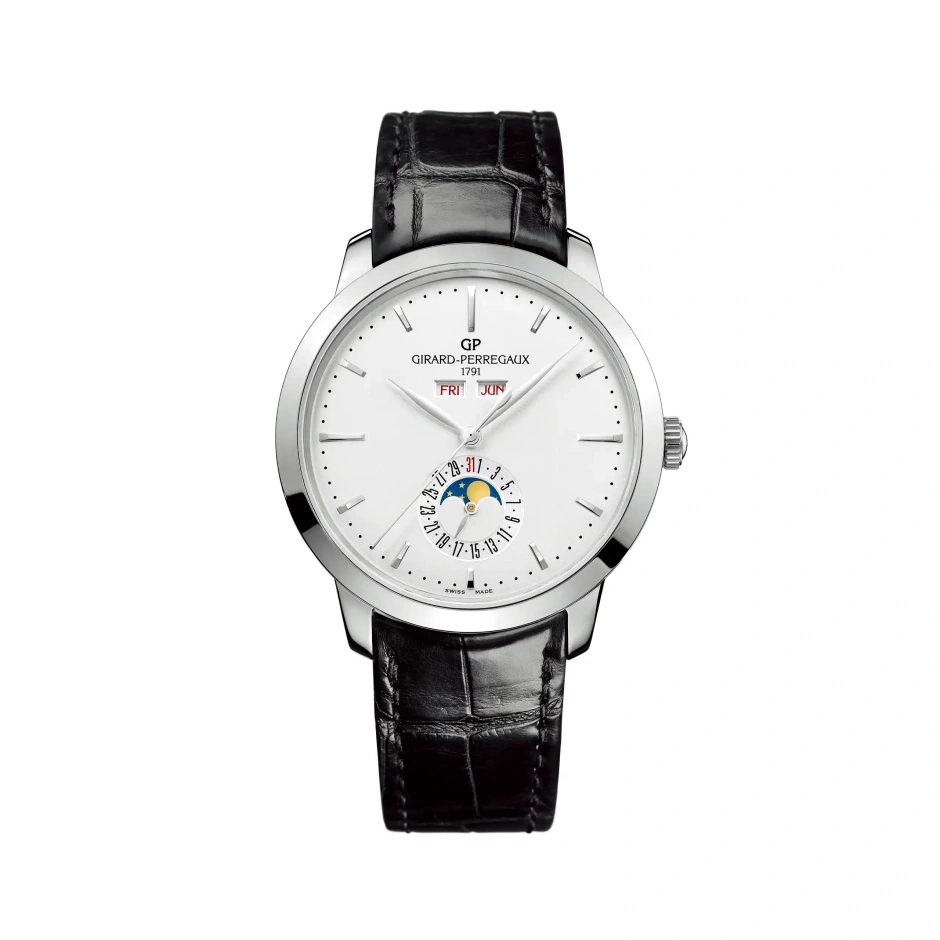 磨き抜かれた優美なフォルムにシルバー文字盤、シンプルなデザインの中に月・日・曜日、さらにムーンフェイズ機構が搭載。シースルーバックのケース裏面からは、繊細な波模様のコート・ド・ジュネーブ装飾やペラルージュ装飾をはじめとする圧倒的な仕上げの美しさを誇るローター付きの高精度・自社製機械式自動巻きムーブメント 「GP3300」をご鑑賞頂けます。