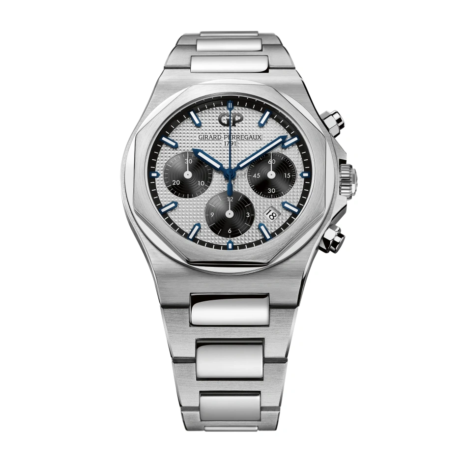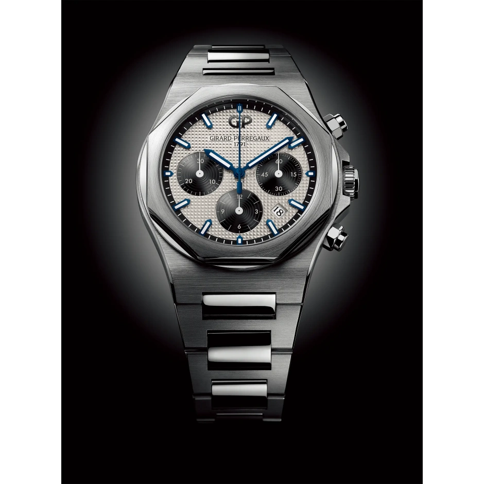 1791年創業の老舗名門マニュファクチュールブランド「ジラール・ぺルゴ」が誇るラグジュアリー・スポーツウオッチの傑作「ロレアート」コレクションより、クロノグラフ機構搭載モデルです。文字盤には職人が施したクル・ド・パリと呼ばれるピラミッド型のエングレービングが彫刻されており、角度や光の加減によって生まれる陰影や光沢の美しいコントラストが様々な表情と感動を私達の腕元に届けてくれます。
