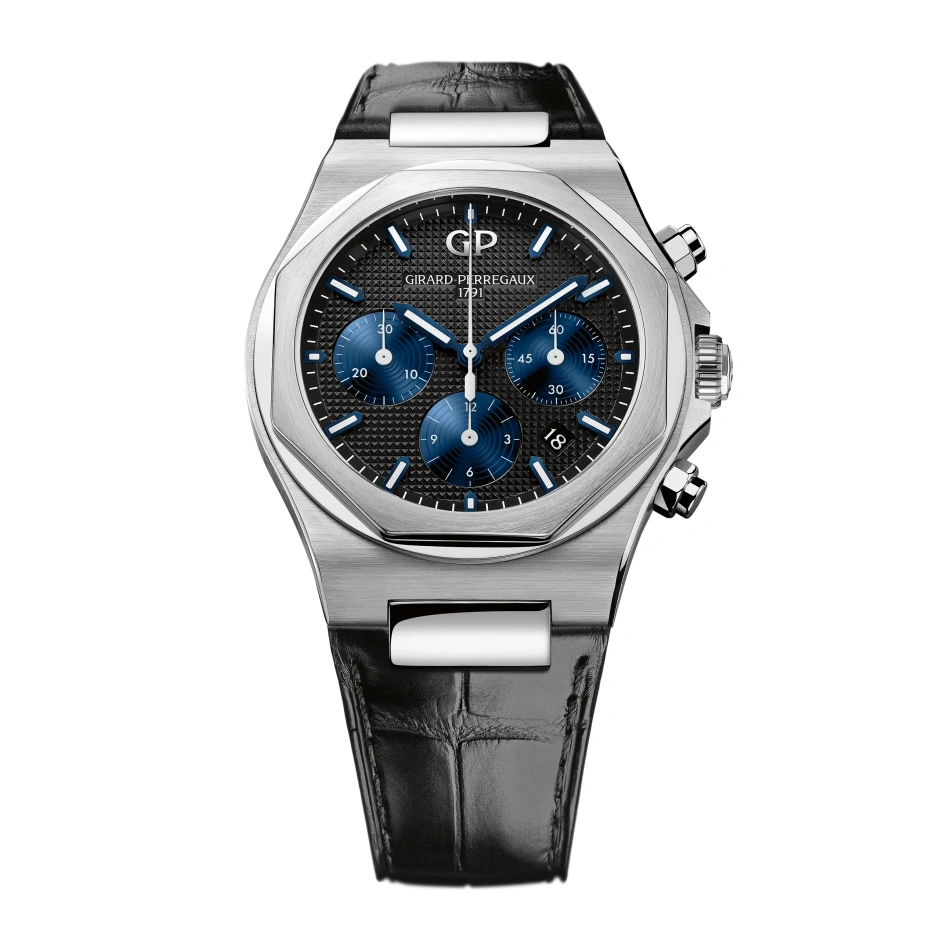 1791年創業の老舗名門マニュファクチュールブランド「ジラール・ぺルゴ」が誇るラグジュアリー・スポーツウオッチの傑作「ロレアート」コレクションより、クロノグラフ機構搭載モデルです。文字盤には職人が施したクル・ド・パリと呼ばれるピラミッド型のエングレービングが彫刻されており、角度や光の加減によって生まれる陰影や光沢の美しいコントラストが様々な表情と感動を私達の腕元に届けてくれます。