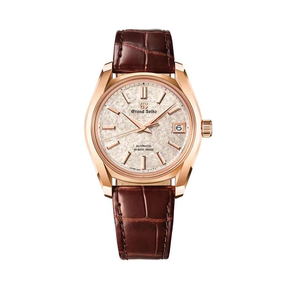 グランドセイコー初の自動巻メカニカルモデル「62GS」を現代的解釈によってアレンジし、日本特有の季節の移ろいをダイヤルに宿したモデルが登場。ヘリテージコレクション「62GS」レギュラーモデルでは初となる18Kピンクゴールドのケースを採用しました。その輝きに映えるあたたかみのあるピンクのダイヤルは、朝日を浴びる「桜隠し」と呼ばれる桜の花を雪が覆い隠す情景を表現。桜の幹色をイメージしたブラウンレザーのバンドと共に、美しく静謐な佇まいを見せるモデルです。ムーブメントにはハイビートムーブメント「キャリバー9S85」を搭載し、精度のばらつきを抑え、より安定した高精度を実現しています。