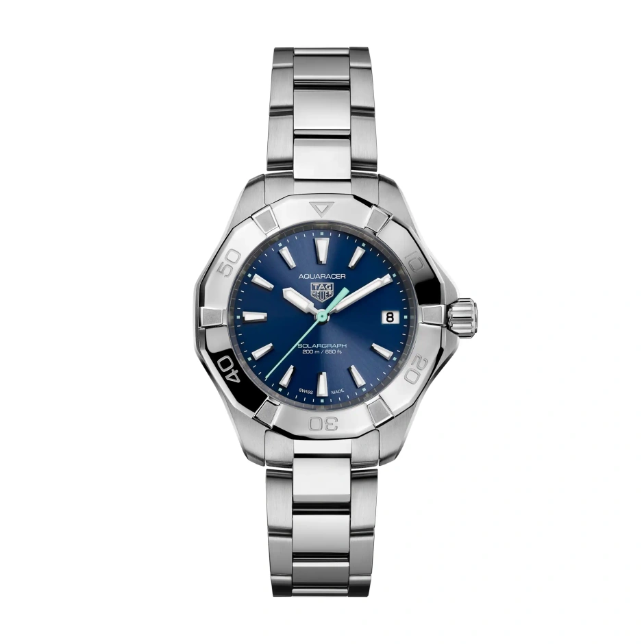 アウトドアのために生まれた、タグ・ホイヤー「アクアレーサー プロフェッショナル200 ソーラーグラフ」は、無限のエネルギー源である太陽を利用した革新的なソーラーグラフモジュール搭載のタグ・ホイヤー初のソーラーパワーウォッチです。最新のムーブメントを採用して太陽や人工の光など、あらゆる光を原動力とするソーラーグラフキャリバー(TH50-01)を搭載することで、 日中も夜間も途切れることなく比類のないパフォーマンスを発揮します。 ブルー・サンレイ加工のダイヤルに、ホワイトのスーパールミノバ®が塗布された針とインデックスが上品にあしらわれ、暗闇の中でも優れた視認性を確保します。