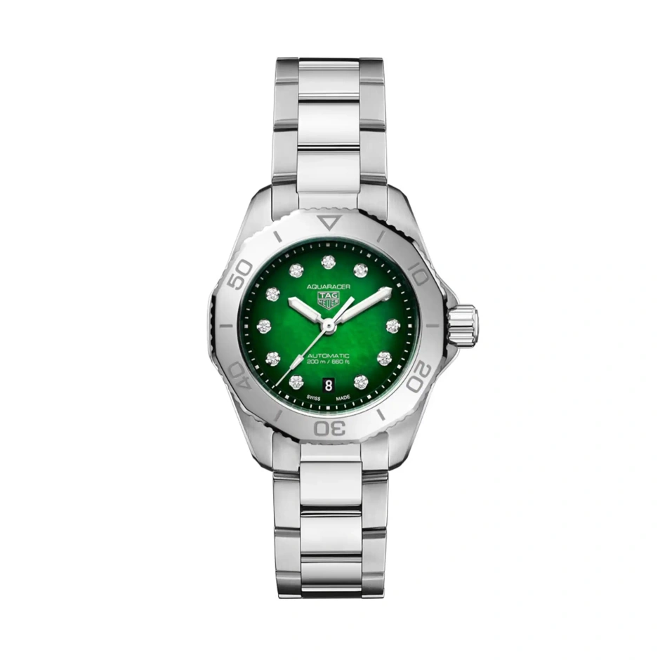 温かみのある秋のカラーを讃える、30mmのタグ・ホイヤー「アクアレーサー プロフェッショナル200 デイト」。深いルビーレッドのマザー オブ パール ダイヤルには、11個のVSダイヤモンド(直径1.40mm / 0.107カラット) がエレガントにセットされています。耐久性に優れたステンレススティール製のラグジュアリー タイムピースです。サテン&ポリッシュ仕上げのステンレススティール製ケースは、これまでになくエルゴノミックなデザイン。200mの防水性を備え、60分スケールベゼルが最大限の精度を叶えます。