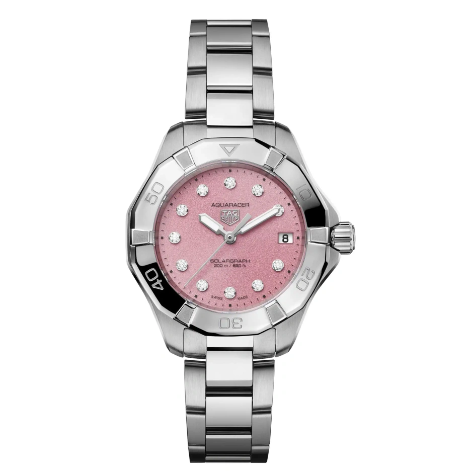 タグ・ホイヤー 「アクアレーサー プロフェッショナル200・ ソーラーグラフ」は、エレガンスとパフォーマンスを併せ持ち、タグ・ホイヤーが誇る汎用性のあるツールウォッチに洗練されたデザインを加えます。11個のダイヤモンドのインデックスが輝くピンクのダイヤルは、オーロラの壮麗な美しさを思わせ、冒険心をスタイリッシュに讃えます。