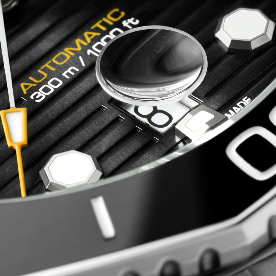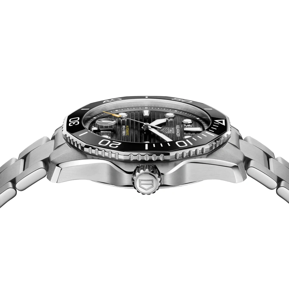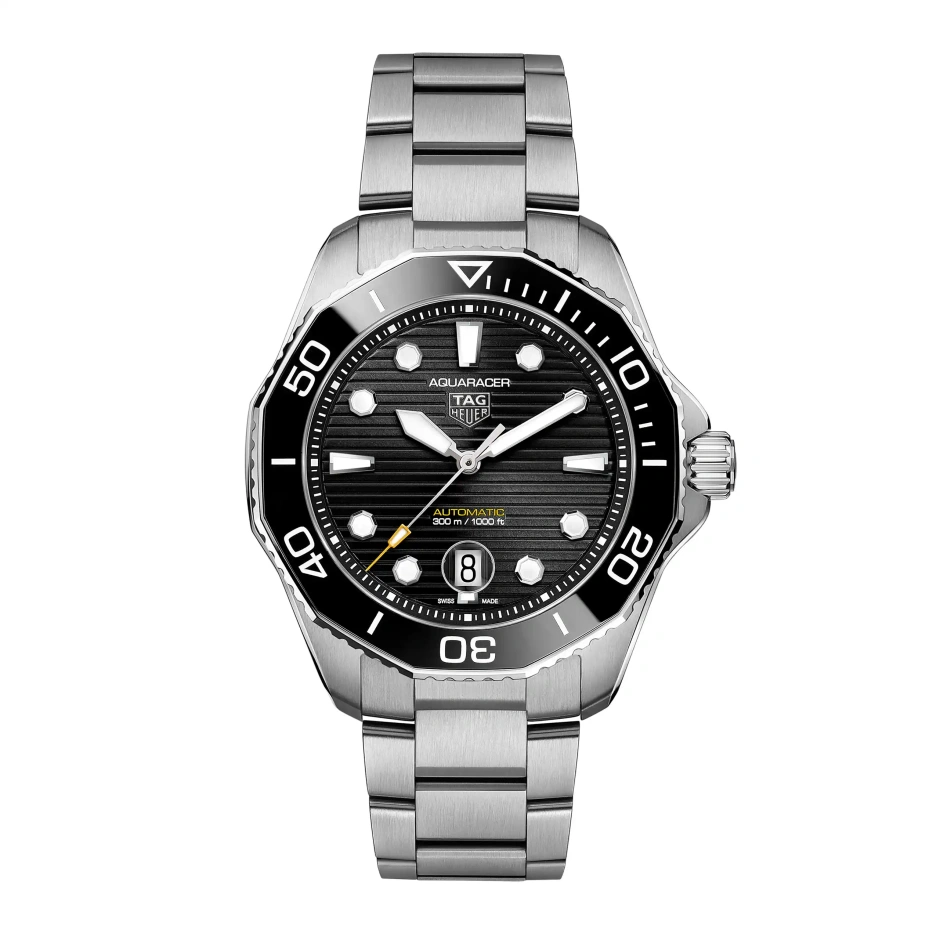 自動巻ムーブメント キャリバー5を搭載した新しいタグ・ホイヤー アクアレーサー。ブラックのサンレイサテン仕上げを施した文字盤を備え、最大300メートルの防水性を備えます。どんな状況にも耐え得る真のダイビングウォッチ。
