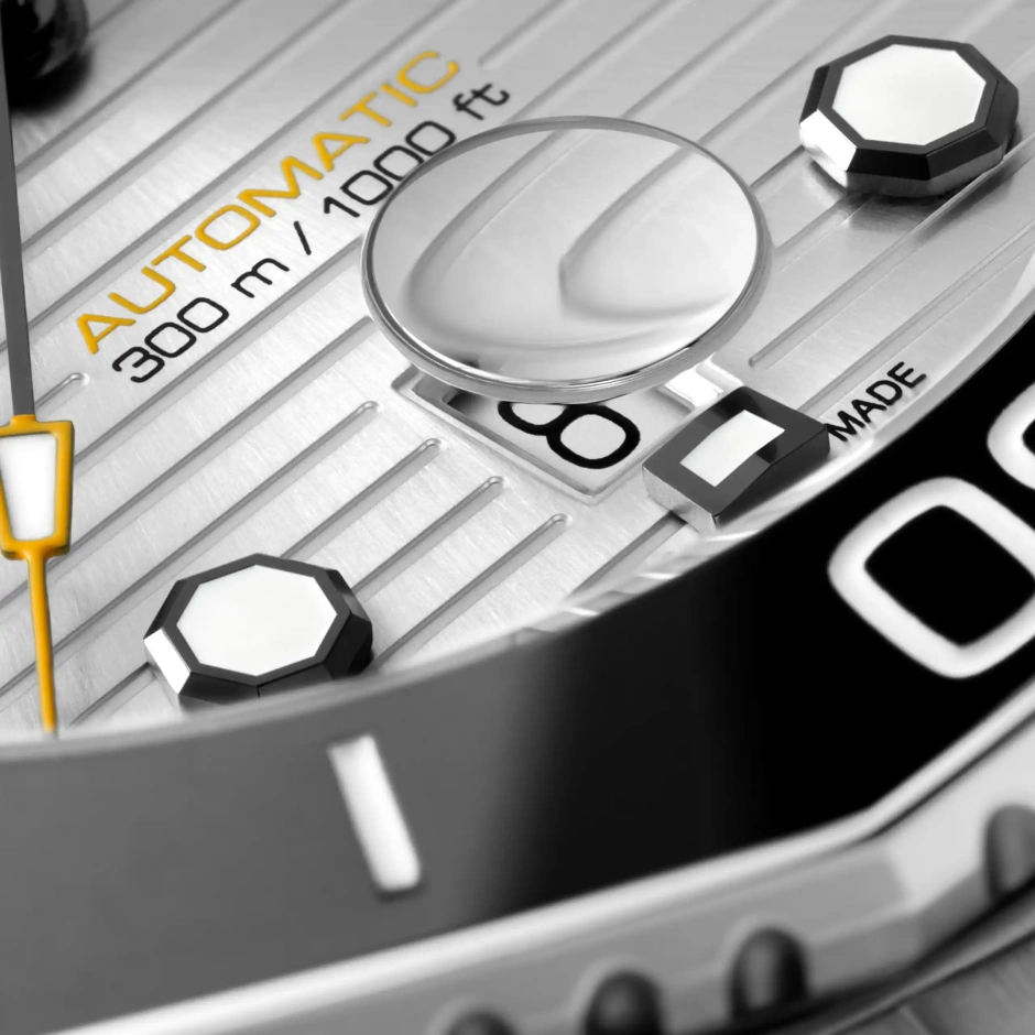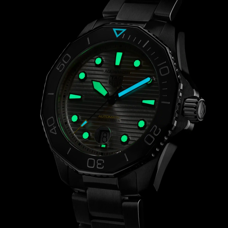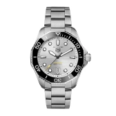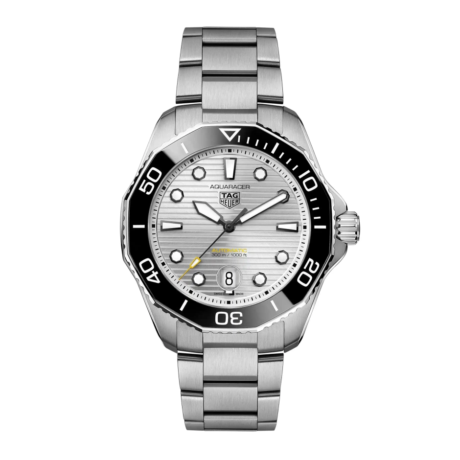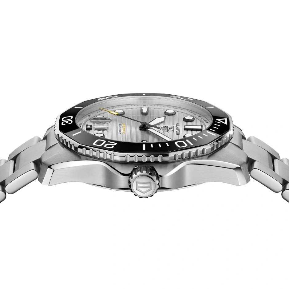 自動巻ムーブメント キャリバー5を搭載した新しいタグ・ホイヤー アクアレーサー。シルバーのサンレイブラッシュド仕上げを施した文字盤を備え、最大300メートルの防水性を備えます。どんな状況にも耐え得る真のダイビングウォッチ。