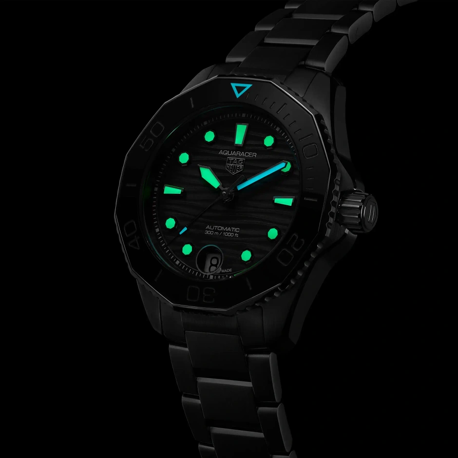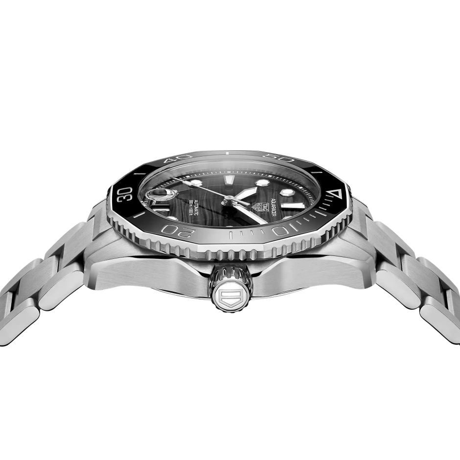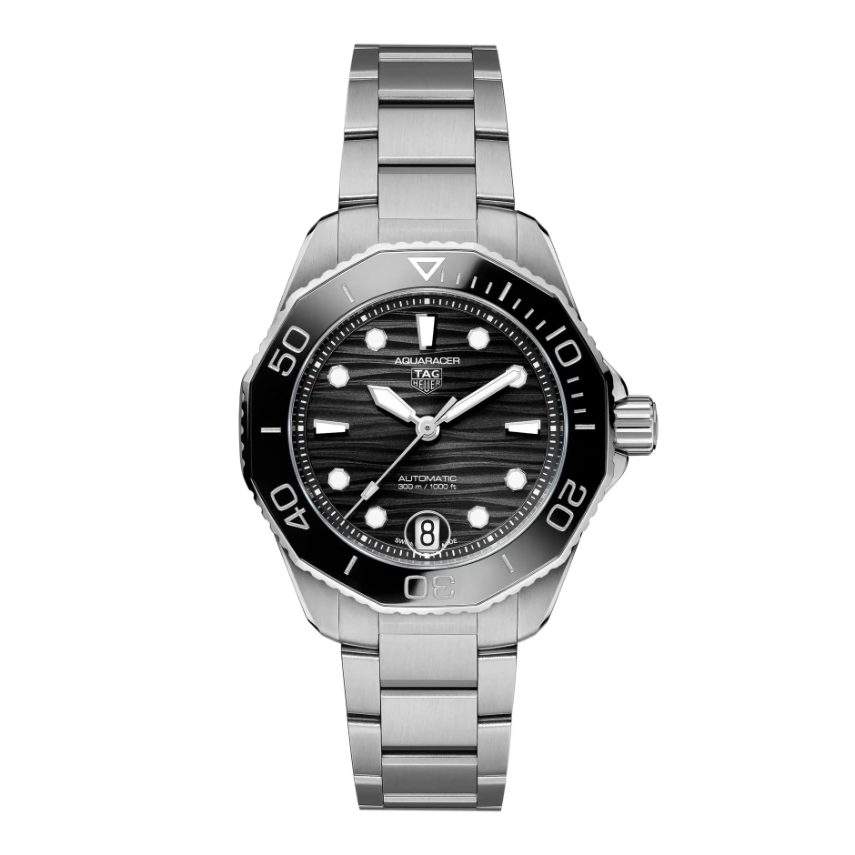 深海潜水のプロフェッショナルツール キャリバー5自動巻ムーブメントを搭載した新しいタグ・ホイヤー アクアレーサー。波模様の仕上げが施されたブラックの文字盤を備えます。スリムなケースに調整可能なクラスプが付いたテーパースティール製ブレスレットが合わせられ、様々な動きにも対応するフィット感を実現しています。