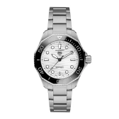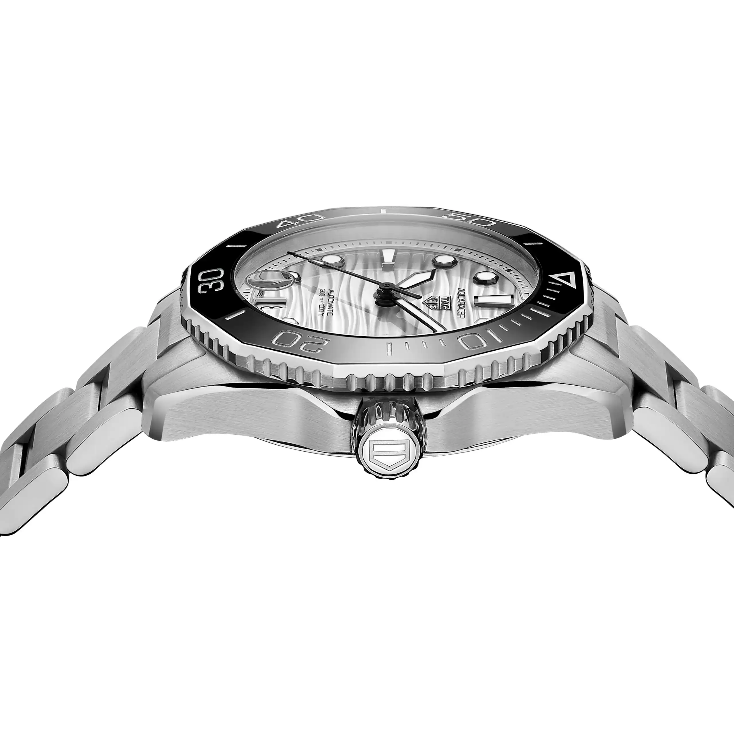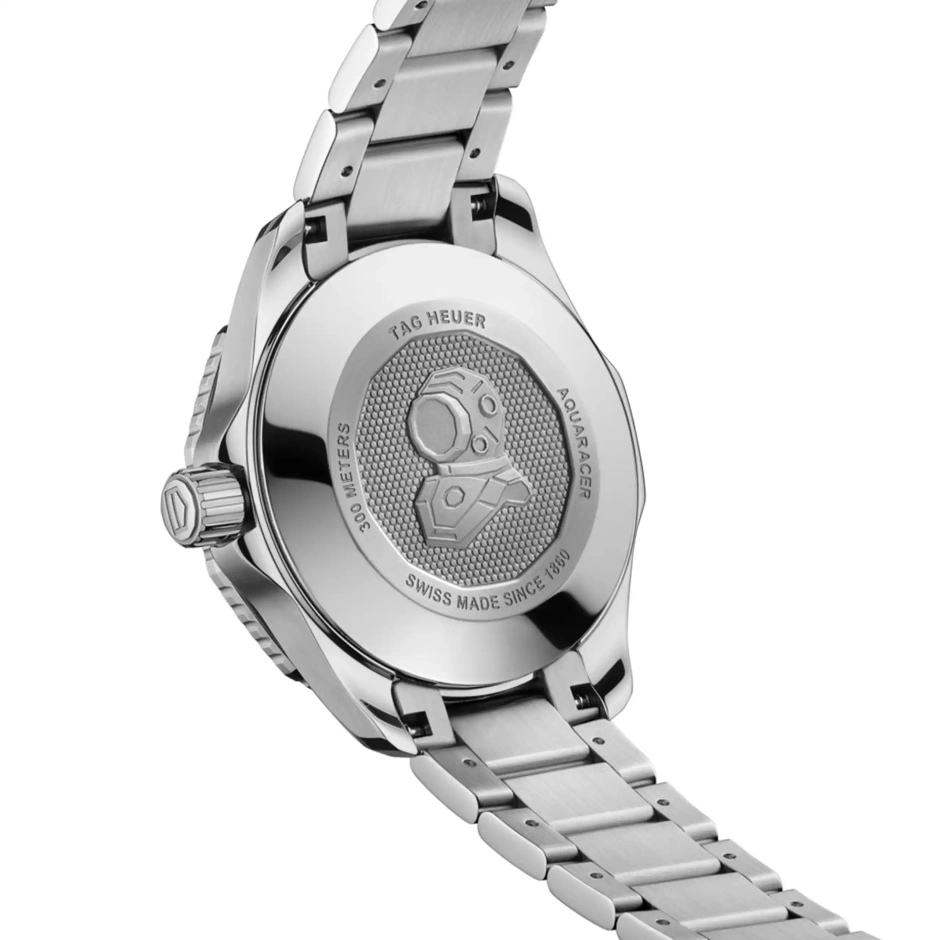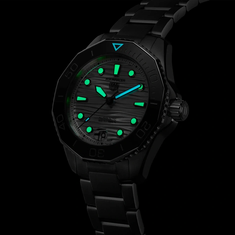 自動巻ムーブメント キャリバー5を搭載し、波模様の仕上げを施したシルバーラッカーダイヤルを備えるタグ・ホイヤー アクアレーサー。自らを超越するパフォーマンスをサポートするウォッチです。深海への潜水のためのデザインである一方、優れた汎用性で日常使いにも最適です。