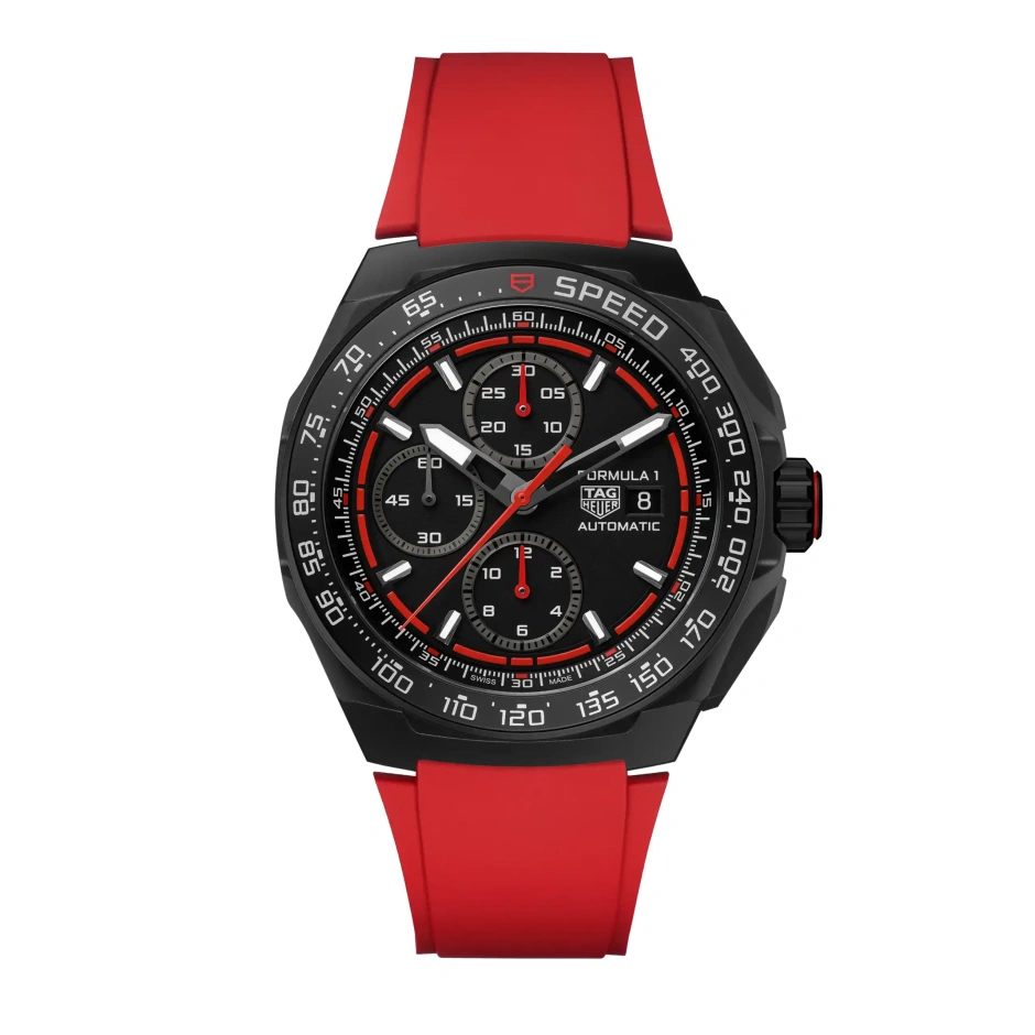 レースの緊張感からインスパイアされたケース径44mmのタグ・ホイヤー「フォーミュラ1 クロノグラフ」は、生粋のモーターレーシングファンのためにデザインされたウォッチ。滑らかなグレード2チタン製ケースと鮮やかなレッドのアクセントが、サーキットの中でも外でも大胆なステートメントを放ちます。