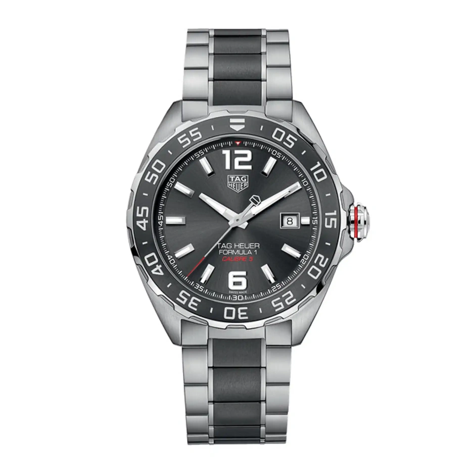 グレーのダイヤルとサテン/ポリッシュ仕上げスティール&セラミック製ブレスレットを備えた、都会的で男性的なスポーツウォッチ。堅牢な自動巻ムーブメント、キャリバー5を搭載し、モーターレーシングをイメージしたデザインと優れた耐久性を誇るタイムピース。