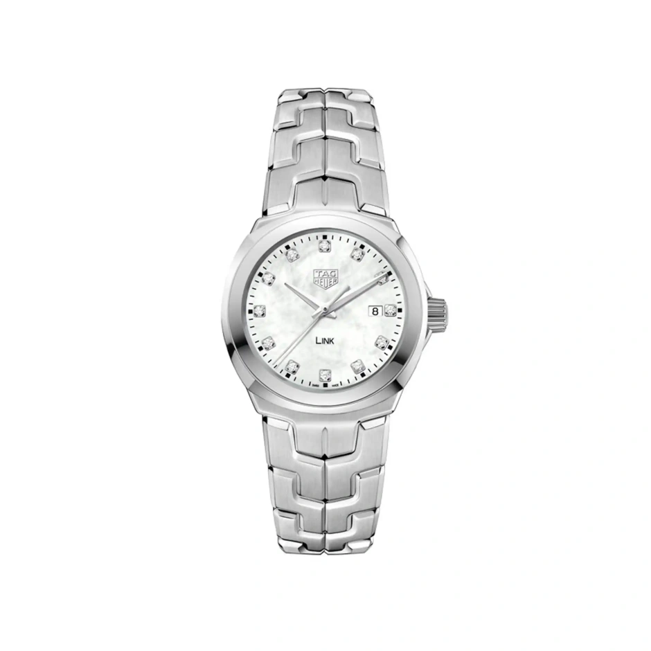 魅力的でフェミニンなダイヤモンド(0.116 CT) クォーツ エディションのタグ・ホイヤー リンク デイトにはホワイトのマザー・オブ・パールのダイヤルを採用。スレンダーな32mmケースにはサテン/ポリッシュ仕上げステンレススティールを使用し、それにマッチするポリッシュ仕上げスティール製ベゼルとアイコニックなS型ブレスレットを組み合わせています。