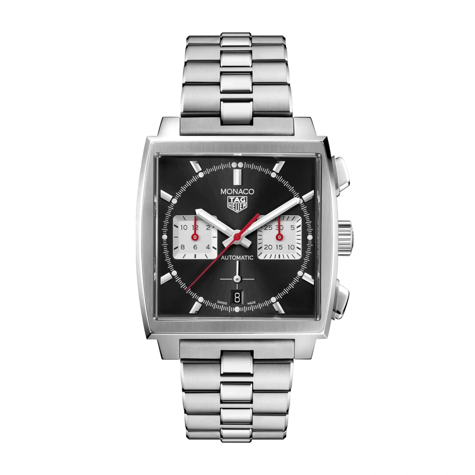 このモナコ クロノグラフは、エレガントなブラックサンレイ加工サテン仕上げのダイヤル、39mmスクエアケースにレッドのアクセントが特徴です。タグ・ホイヤーの中でも最も有名なこのアイコンを祝うため、「モナコ」コレクションの伝統的なカラーを復活させただけでなく、自社製ムーブメント キャリバー ホイヤー02も搭載しています。